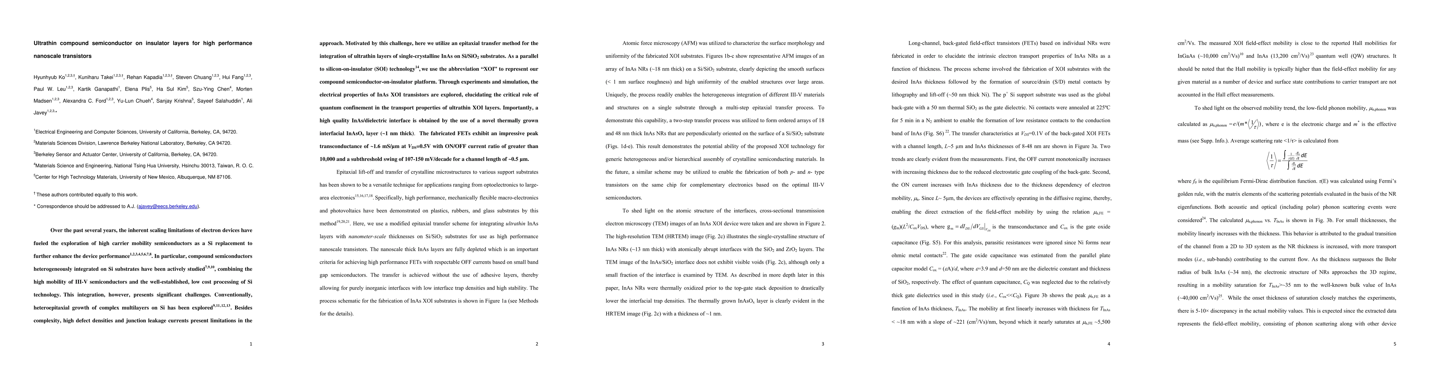 Over the past several years, the inherent scaling limitations of electron devices have fueled the exploration of high carrier mobility semiconductors as a Si replacement to further enhance the device performance. In particular, compound semiconductors heterogeneously integrated on Si substrates have been actively studied, combining the high mobility of III-V semiconductors and the well-established, low cost processing of Si technology. This integration, however, presents significant challenges. Conventionally, heteroepitaxial growth of complex multilayers on Si has been explored. Besides complexity, high defect densities and junction leakage currents present limitations in the approach. Motivated by this challenge, here we utilize an epitaxial transfer method for the integration of ultrathin layers of single-crystalline InAs on Si/SiO2 substrates. As a parallel to silicon-on-insulator (SOI) technology14,we use the abbreviation "XOI" to represent our compound semiconductor-on-insulator platform. Through experiments and simulation, the electrical properties of InAs XOI transistors are explored, elucidating the critical role of quantum confinement in the transport properties of ultrathin XOI layers. Importantly, a high quality InAs/dielectric interface is obtained by the use of a novel thermally grown interfacial InAsOx layer (~1 nm thick). The fabricated FETs exhibit an impressive peak transconductance of ~1.6 mS/{\mu}m at VDS=0.5V with ON/OFF current ratio of greater than 10,000 and a subthreshold swing of 107-150 mV/decade for a channel length of ~0.5 {\mu}m.