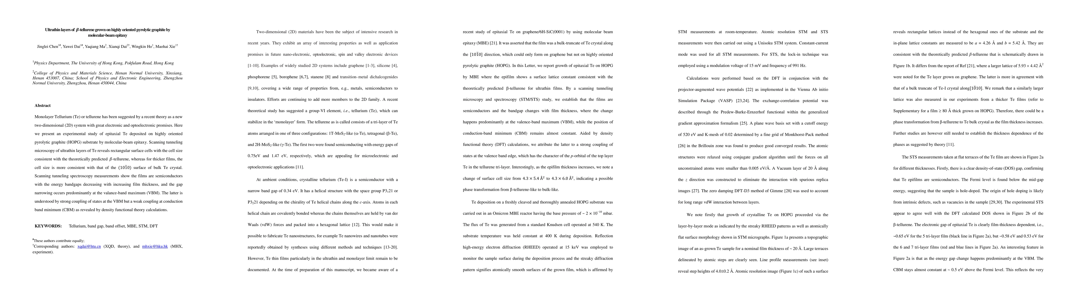 This study experimentally grows ultrathin layers of beta-tellurene on HOPG using molecular-beam epitaxy, revealing semiconductor properties with bandgaps decreasing with film thickness, primarily due to strong coupling at the VBM and weak coupling at the CBM.