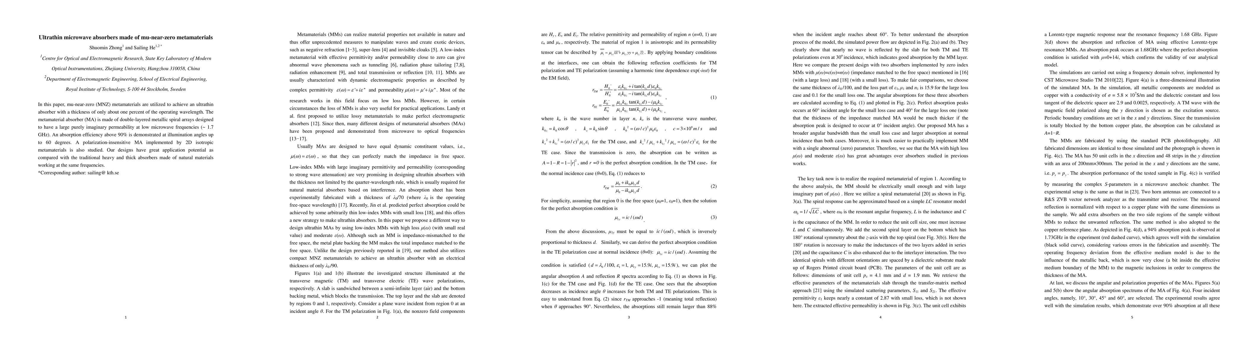 This paper presents ultrathin microwave absorbers based on mu-near-zero metamaterials, achieving an absorption efficiency of over 90% with a thickness of just 1% of the operating wavelength (~1.7 GHz). The design features double-layered metallic spiral arrays and is polarization-insensitive, offering significant advantages over traditional, bulkier absorbers.