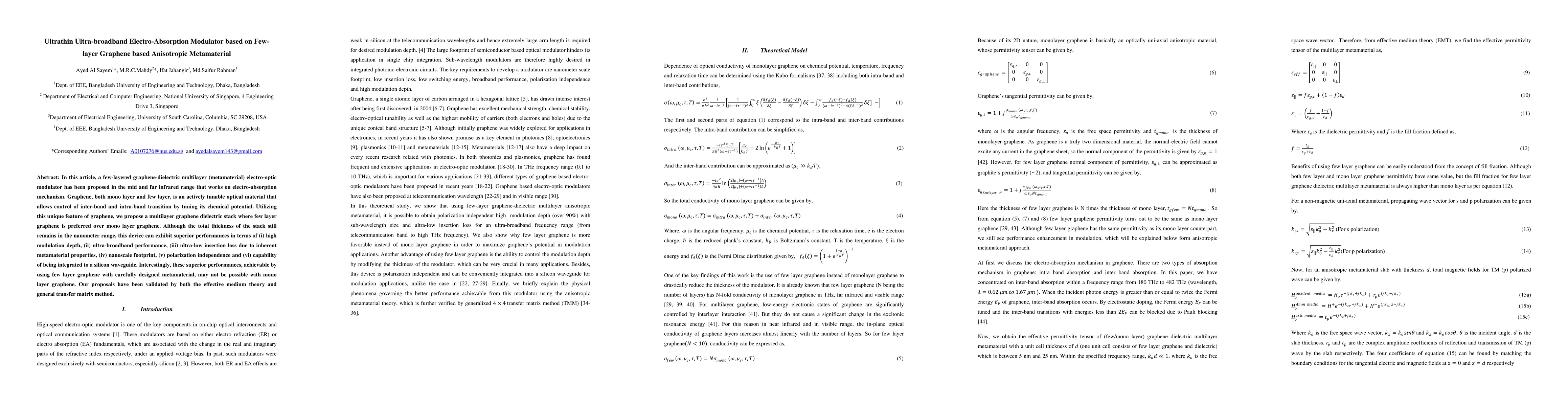 This paper proposes an ultrathin, ultra-broadband electro-absorption modulator based on a few-layer graphene metamaterial, demonstrating high modulation depth, ultra-broadband performance, low insertion loss, and polarization independence compared to mono-layer graphene. Validations are performed using effective medium theory and transfer matrix methods.