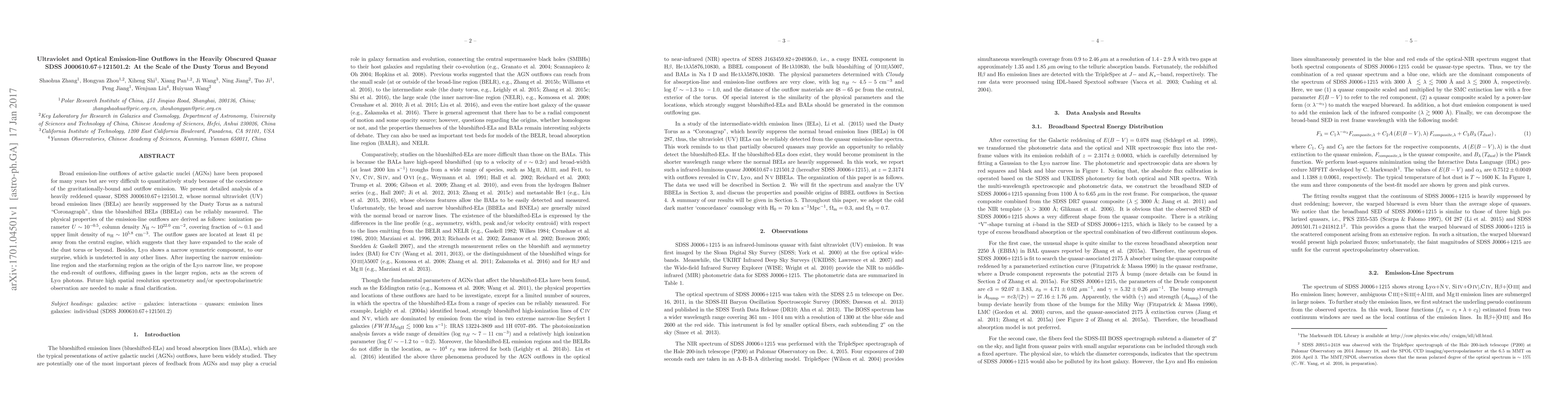 This paper investigates the emission-line outflows in the heavily obscured quasar SDSS J000610.67+121501.2, revealing outflow properties via suppressed UV lines due to the dusty torus. The outflow has an ionization parameter of $U \sim 10^{-0.5}$, a column density of $N_{\rm H}\sim 10^{22.0}$ cm$^{-2}$, and extends at least 41 pc from the central engine.
