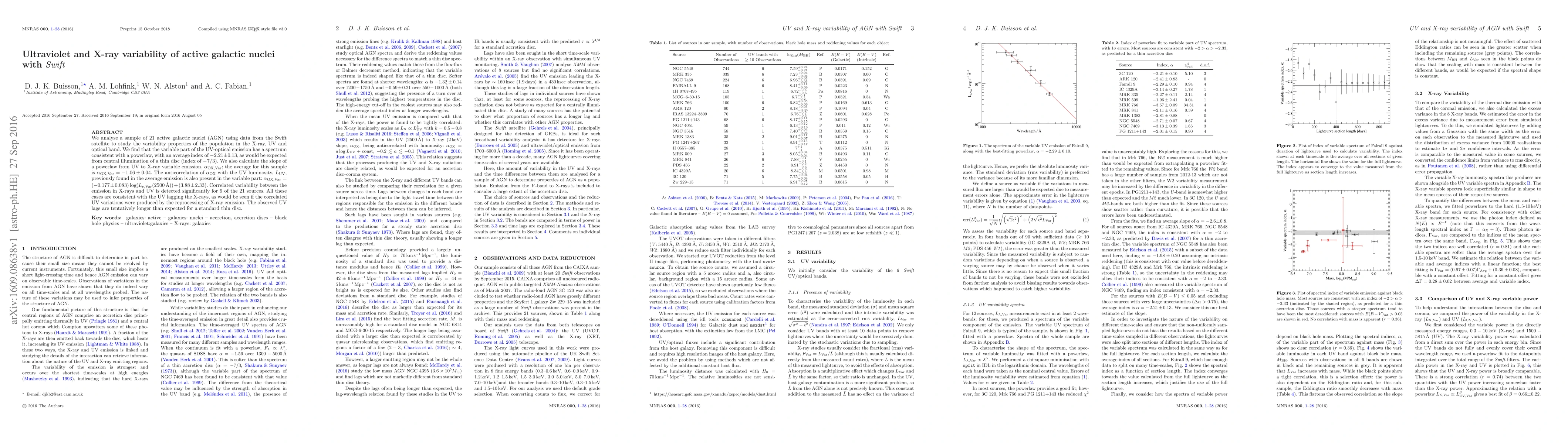 This study analyzes the ultraviolet (UV) and X-ray variability of 21 active galactic nuclei (AGN) using Swift satellite data, finding a powerlaw spectrum for the variable UV-optical emission. The study also detects significant correlated variability between UV and X-ray emissions in 9 sources, suggesting UV variations are likely produced by reprocessing of X-ray emission.