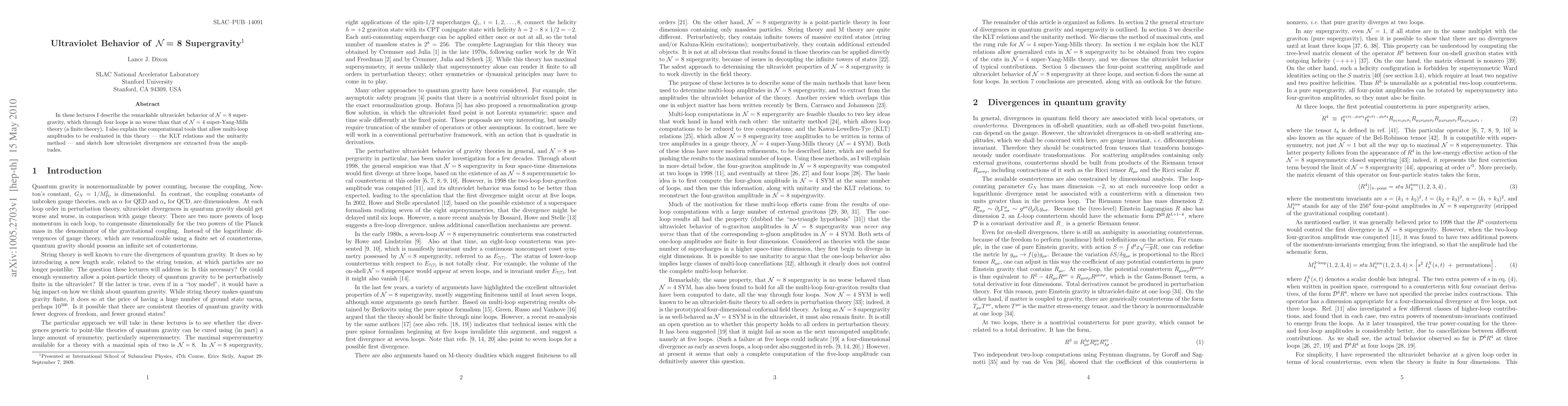 This paper discusses the excellent ultraviolet behavior of N=8 supergravity, showing that its perturbative expansion is finite up to four loops, comparable to N=4 super-Yang-Mills theory. It also outlines the KLT relations and unitarity method for evaluating multi-loop amplitudes and extracting divergences.