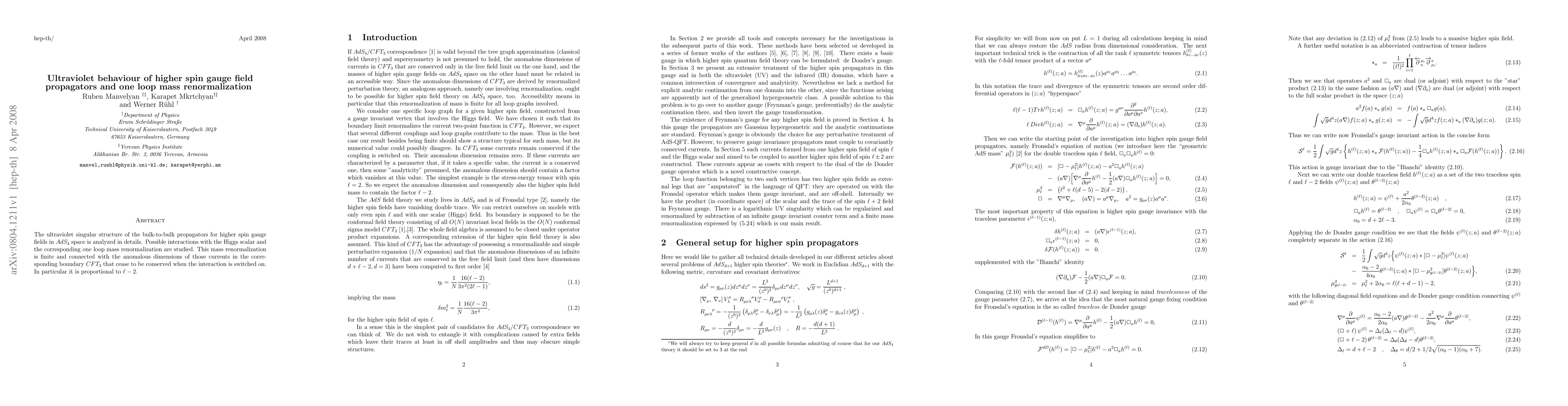 This paper analyzes the ultraviolet behavior of higher spin gauge field propagators in $AdS_{4}$ space, focusing on their interactions with the Higgs scalar and the resulting finite one-loop mass renormalization, which is linked to the anomalous dimensions of non-conserved currents in the boundary $CFT_{3}$. The mass renormalization is proportional to $\ell-2$.