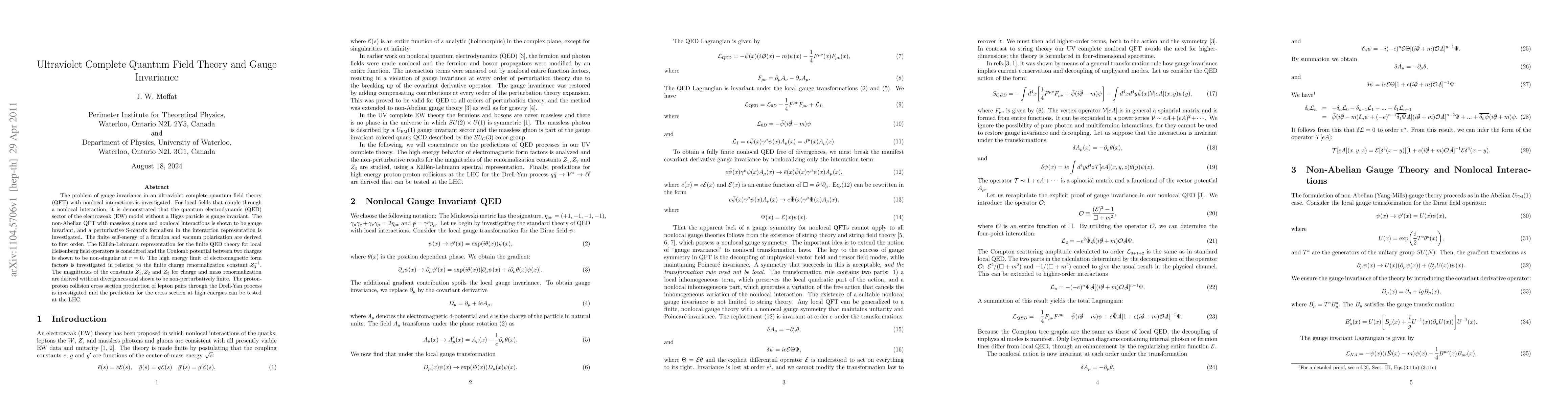 The problem of gauge invariance in an ultraviolet complete quantum field theory (QFT) with nonlocal interactions is investigated. For local fields that couple through a nonlocal interaction, it is demonstrated that the quantum electrodynamic (QED) sector of the electroweak (EW) model without a Higgs particle is gauge invariant. The non-Abelian QFT with massless gluons and nonlocal interactions is shown to be gauge invariant, and a perturbative S-matrix formalism in the interaction representation is investigated. The finite self-energy of a fermion and vacuum polarization are derived to first order. The K\"all\'en-Lehmann representation for the finite QED theory for local Heisenberg field operators is considered and the Coulomb potential between two charges is shown to be non-singular at $r=0$. The high energy limit of electromagnetic form factors is investigated in relation to the finite charge renormalization constant $Z_3^{-1}$. The magnitudes of the constants $Z_1,Z_2$ and $Z_3$ for charge and mass renormalization are derived without divergences and shown to be non-perturbatively finite. The proton-proton collision cross section production of lepton pairs through the Drell-Yan process is investigated and the prediction for the cross section at high energies can be tested at the LHC.