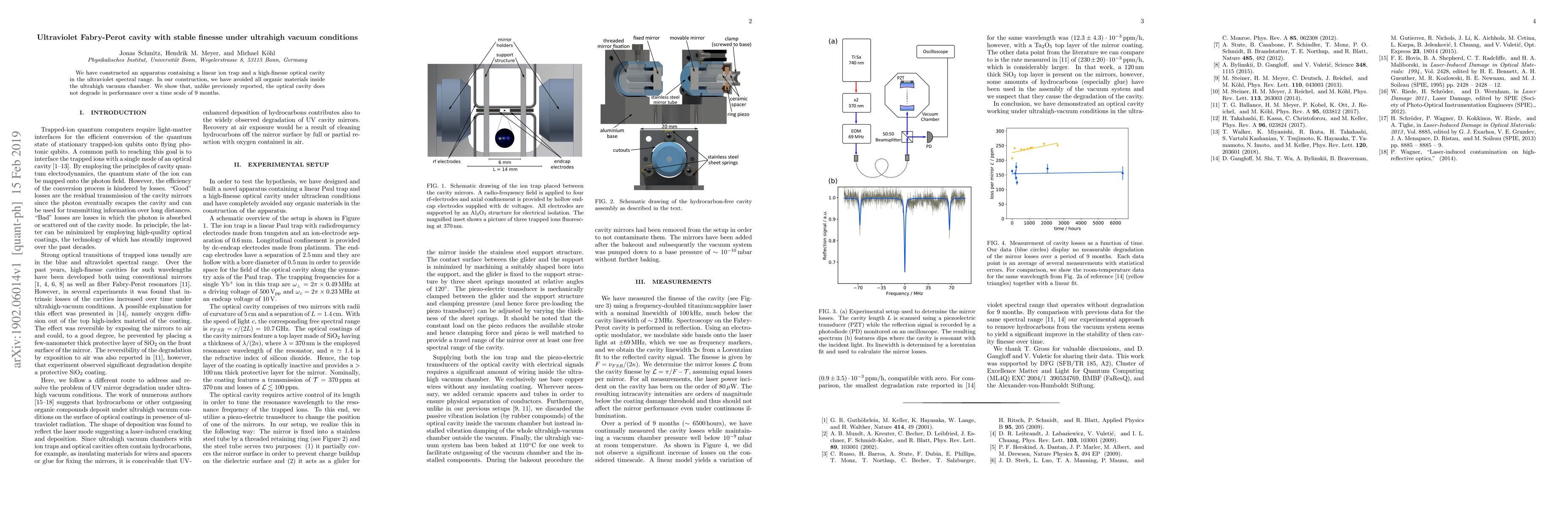 We have constructed an apparatus containing a linear ion trap and a high-finesse optical cavity in the ultraviolet spectral range. In our construction, we have avoided all organic materials inside the ultrahigh vacuum chamber. We show that, unlike previously reported, the optical cavity does not degrade in performance over a time scale of 9 months.
