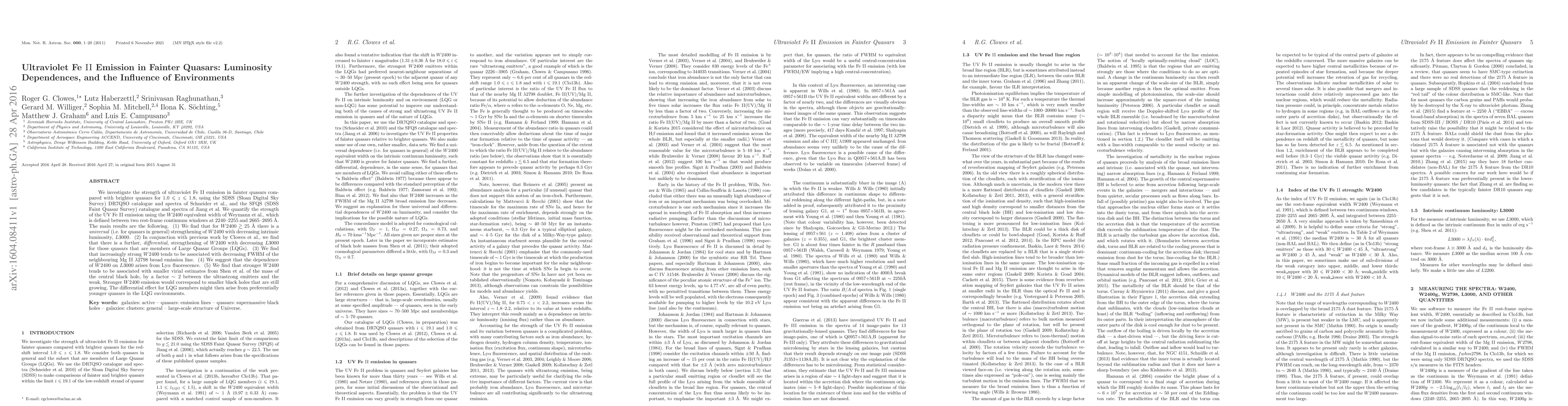 This study investigates the ultraviolet Fe II emission strength in fainter quasars compared to brighter ones, finding a universal strengthening of Fe II emission with decreasing luminosity. It also reveals a differential strengthening in quasars within Large Quasar Groups, suggesting that younger quasars in these environments may drive this effect.
