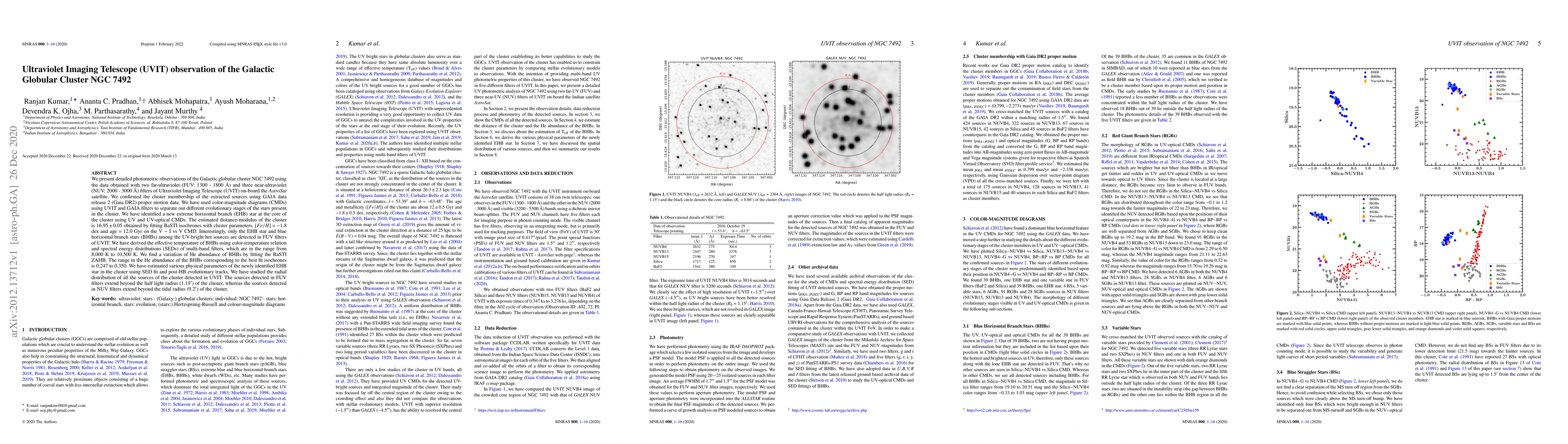 This study uses UVIT on the \textit{AstroSat} satellite to observe the globular cluster NGC 7492, identifying an extreme horizontal branch star and analyzing the cluster's evolutionary stages, He abundance variations, and radial distribution of UV-bright stars. The distance-modulus is estimated at $16.95\pm0.05$, indicating a cluster age of 12.0 Gyr.