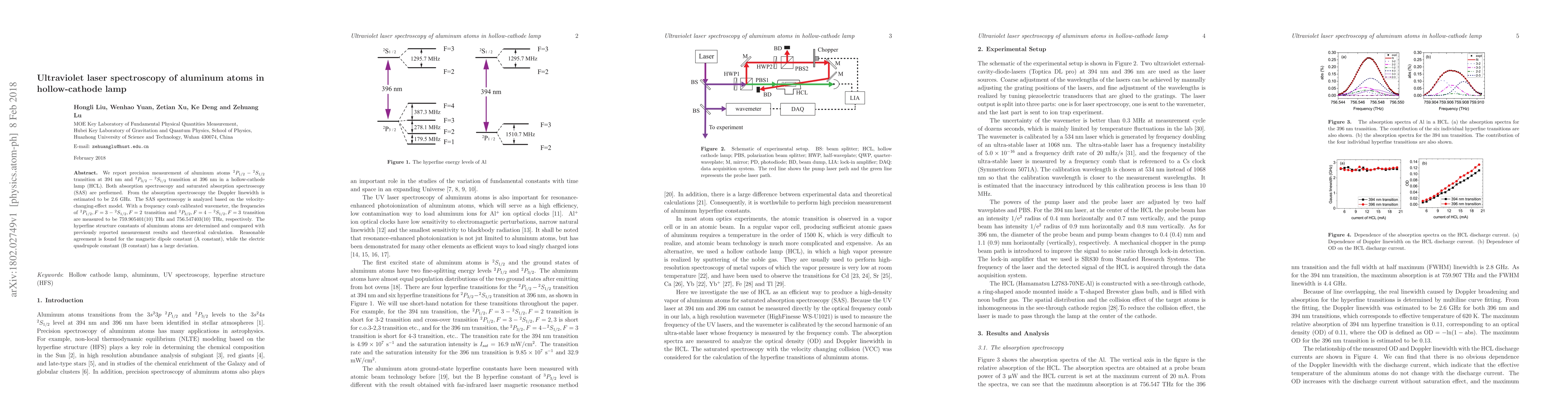 This research precisely measures the transitions of aluminum atoms in a hollow-cathode lamp at 394 nm and 396 nm using absorption and saturated absorption spectroscopy. The Doppler linewidth is estimated at 2.6 GHz, and the frequencies of the transitions are measured at 759.905401(10) THz and 756.547403(10) THz, with reasonable agreement found for the magnetic dipole constant but significant deviation for the electric quadrupole constant.