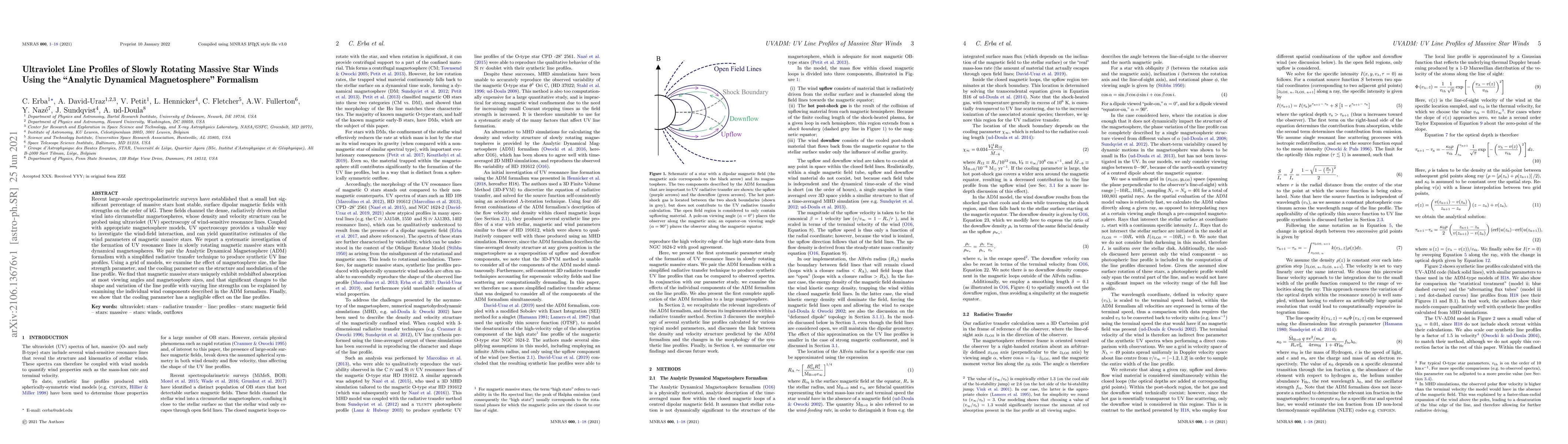 This paper investigates the formation of ultraviolet (UV) resonance lines in slowly rotating magnetic massive stars using the Analytic Dynamical Magnetosphere (ADM) formalism. The study finds that these stars exhibit redshifted absorption in UV line profiles, with variations explained by the ADM model's wind components, while the cooling parameter has minimal impact on the profiles.