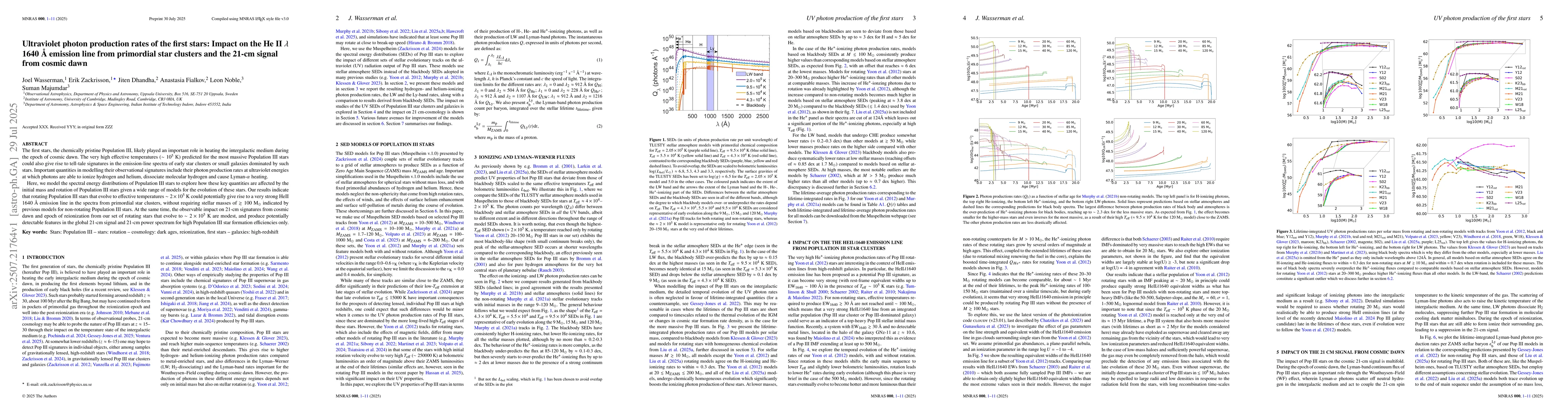 The research models the spectral energy distributions of Population III stars, exploring how key quantities like photon production rates are affected by the initial mass and rotation of these stars, using a range of evolutionary models.