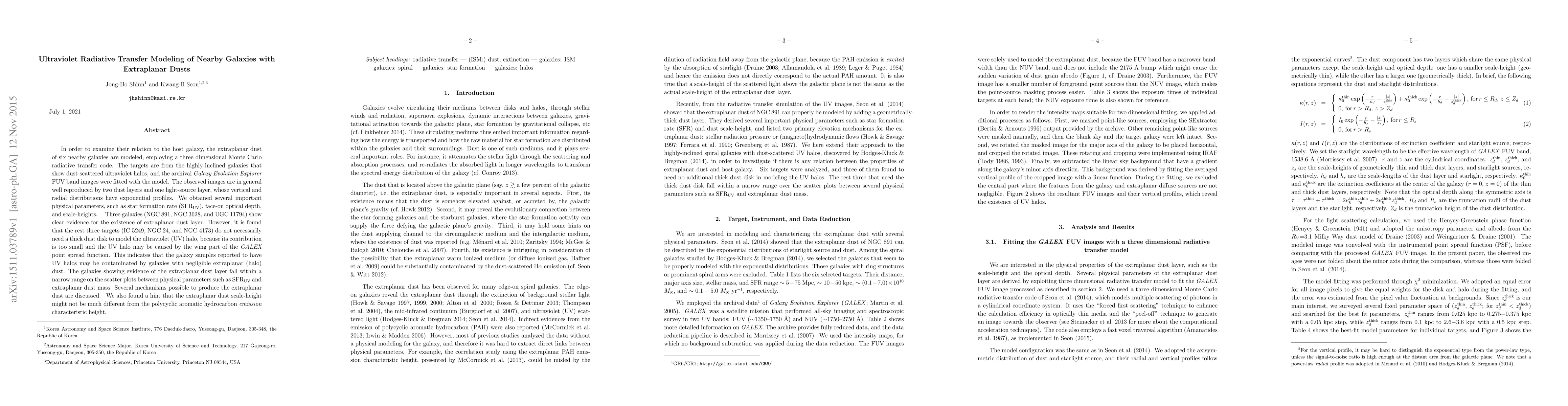 This research uses a 3D Monte Carlo radiative transfer model to analyze six nearby galaxies with extraplanar dusts, finding two dust layers and one light-source layer with exponential profiles generally reproduce observed images. Three galaxies (NGC 891, NGC 3628, and UGC 11794) show clear extraplanar dust layers, while others' UV halos might result from instrumental effects. The study suggests some UV halo galaxy reports may be contaminated by galaxies with minimal extraplanar dust, and identifies a possible link between extraplanar dust scale-height and polycyclic aromatic hydrocarbon emission characteristic height.