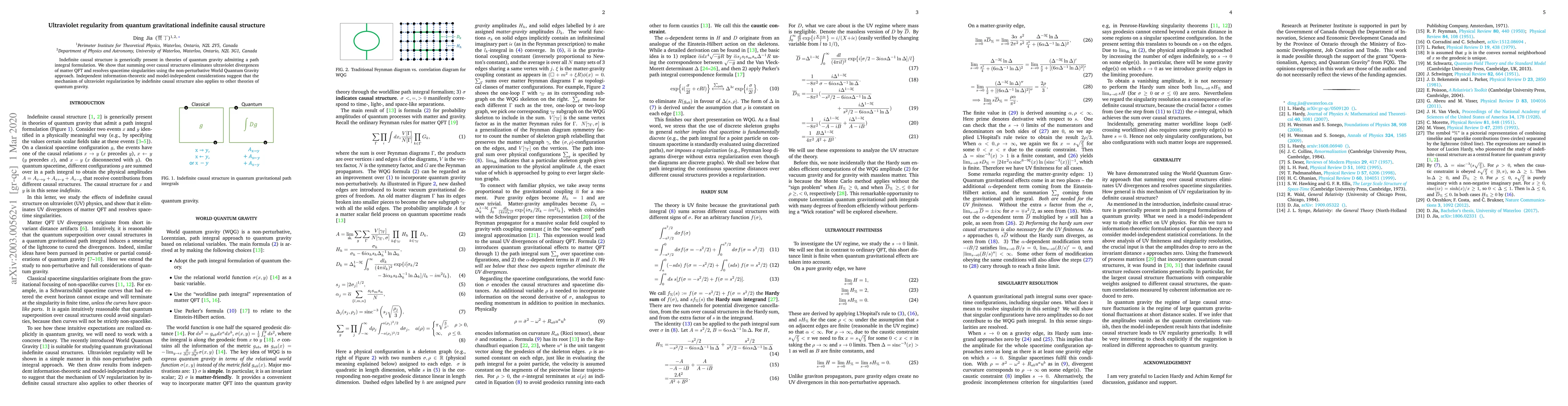 Indefinite causal structure is generically present in theories of quantum gravity admitting a path integral formulation. We show that summing over causal structures eliminates ultraviolet divergences of matter QFT and resolves spacetime singularities using the non-perturbative World Quantum Gravity approach. Independent information-theoretic and model-independent considerations suggest that the mechanism of ultraviolet regularization by indefinite causal structure also applies to other theories of quantum gravity.