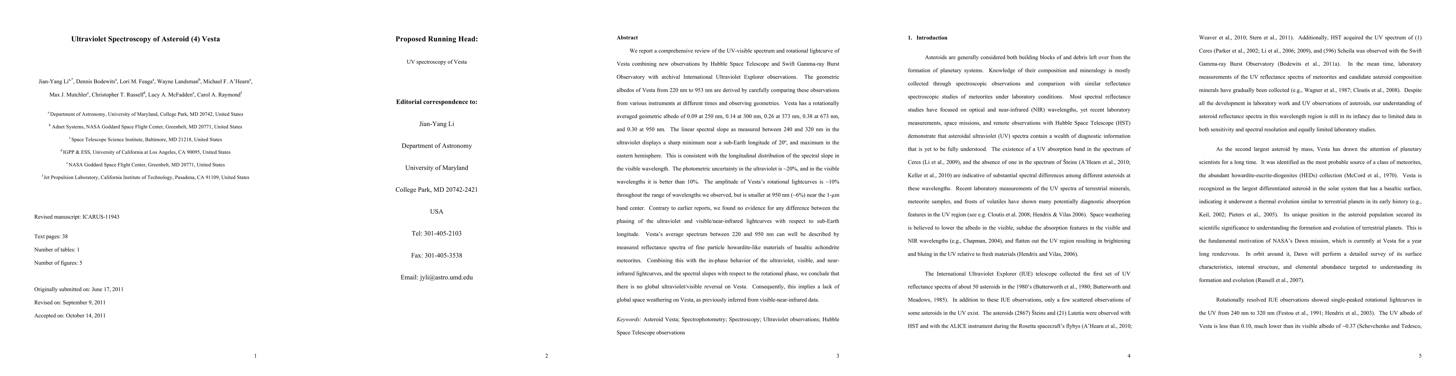 This study combines new Hubble and Swift observations with archival data to derive Vesta's UV-visible spectrum, finding no global ultraviolet/visible reversal, indicating no significant global space weathering on the asteroid. The rotational lightcurve amplitude is ~10% across wavelengths, with no phase difference between UV and visible/near-infrared lightcurves.