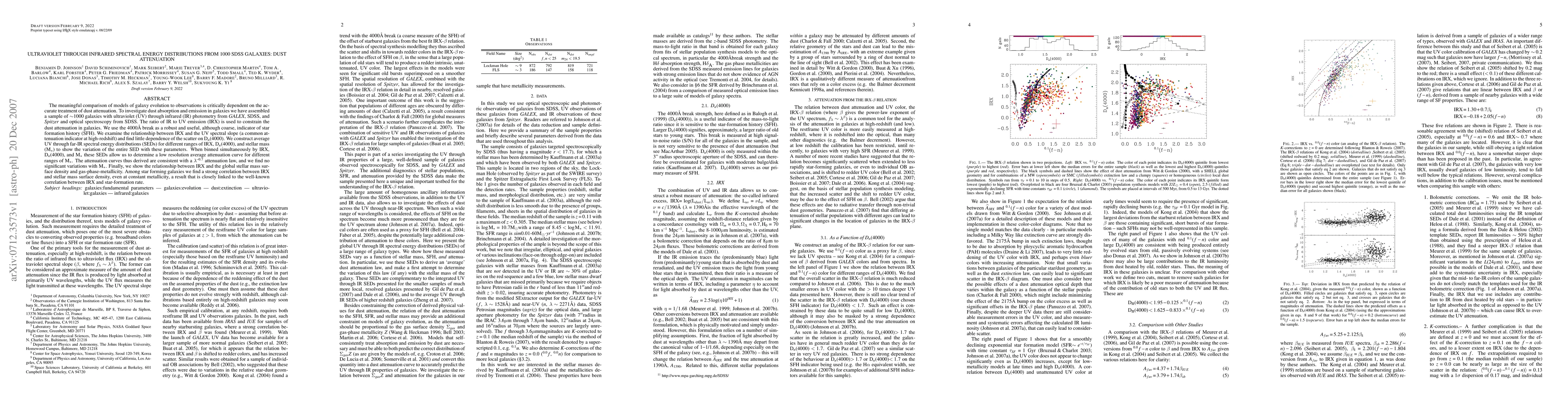 The meaningful comparison of models of galaxy evolution to observations is critically dependent on the accurate treatment of dust attenuation. To investigate dust absorption and emission in galaxies we have assembled a sample of ~1000 galaxies with ultraviolet (UV) through infrared (IR) photometry from GALEX, SDSS, and Spitzer and optical spectroscopy from SDSS. The ratio of IR to UV emission (IRX) is used to constrain the dust attenuation in galaxies. We use the 4000A break as a robust and useful, although coarse, indicator of star formation history (SFH). We examine the relationship between IRX and the UV spectral slope (a common attenuation indicator at high-redshift) and find little dependence of the scatter on 4000A break strength. We construct average UV through far-IR spectral energy distributions (SEDs) for different ranges of IRX, 4000A break strength, and stellar mass (M_*) to show the variation of the entire SED with these parameters. When binned simultaneously by IRX, 4000A break strength, and M_* these SEDs allow us to determine a low resolution average attenuation curve for different ranges of M_*. The attenuation curves thus derived are consistent with a lambda^{-0.7} attenuation law, and we find no significant variations with M_*. Finally, we show the relationship between IRX and the global stellar mass surface density and gas-phase-metallicity. Among star forming galaxies we find a strong correlation between IRX and stellar mass surface density, even at constant metallicity, a result that is closely linked to the well-known correlation between IRX and star-formation rate.