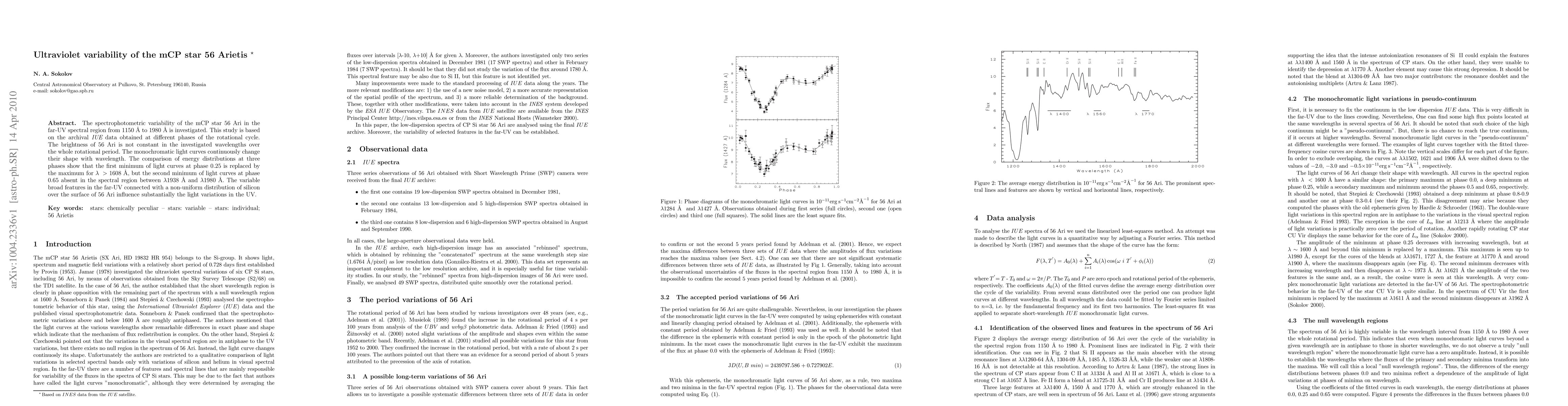 The spectrophotometric variability of the mCP star 56 Ari in the far-UV spectral region from 1150 \AA\ to 1980 \AA\ is investigated. This study is based on the archival {\it IUE} data obtained at different phases of the rotational cycle. The brightness of 56 Ari is not constant in the investigated wavelengths over the whole rotational period. The monochromatic light curves continuously change their shape with wavelength. The comparison of energy distributions at three phases show that the first minimum of light curves at phase 0.25 is replaced by the maximum for $\lambda>$1608\AA, but the second minimum of light curves at phase 0.65 absent in the spectral region between $\lambda$1938\AA\ and $\lambda$1980\AA. The variable broad features in the far-UV connected with a non-uniform distribution of silicon over the surface of 56 Ari influence substantially the light variations in the UV.