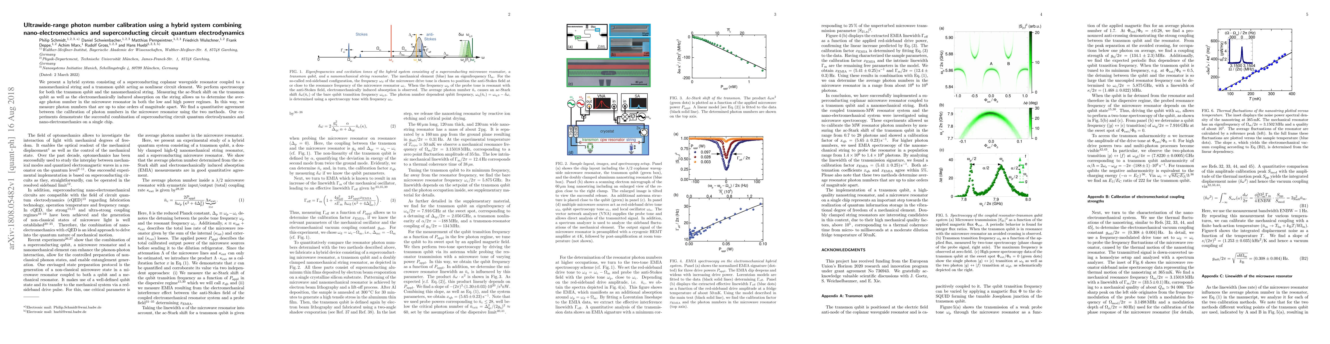 This paper details a hybrid system combining nano-electromechanics and superconducting circuit quantum electrodynamics to calibrate photon numbers over nine orders of magnitude. The system uses a transmon qubit and a nanomechanical string to measure the ac-Stark shift and electromechanically induced absorption, respectively.