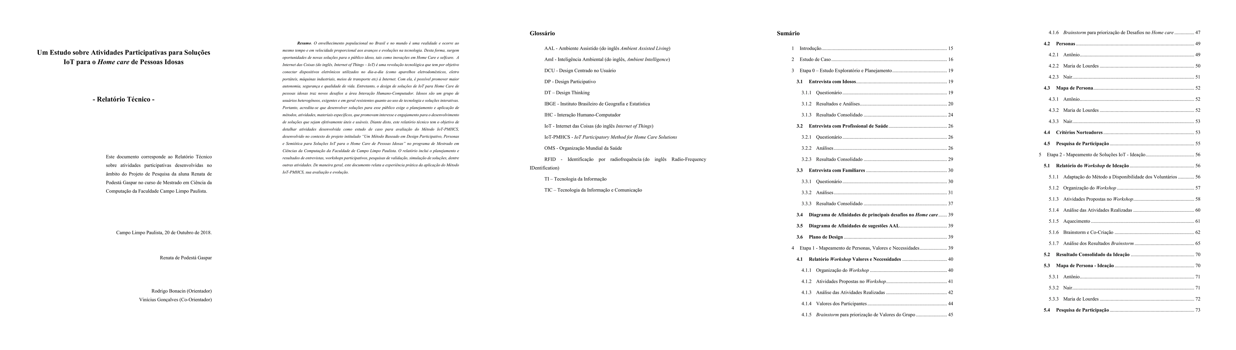 This study explores participatory activities to develop IoT solutions for elderly home care in Brazil, focusing on the IoT-PMHCS Method. The report details a case study involving interviews, workshops, validations, and solution simulations to evaluate the practical application of the method.