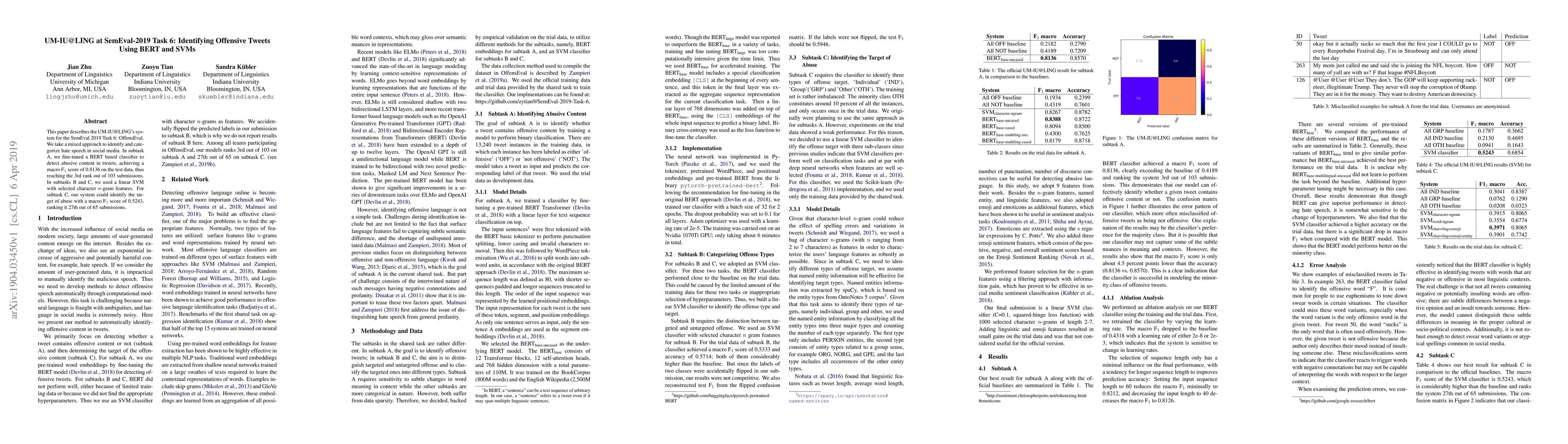 The UM-IU@LING system utilized a mixed approach for SemEval 2019 Task 6 (OffensEval), combining BERT and SVMs. For subtask A, BERT base was fine-tuned to detect abusive content in tweets, while subtasks B and C employed a linear SVM with character n-gram features.