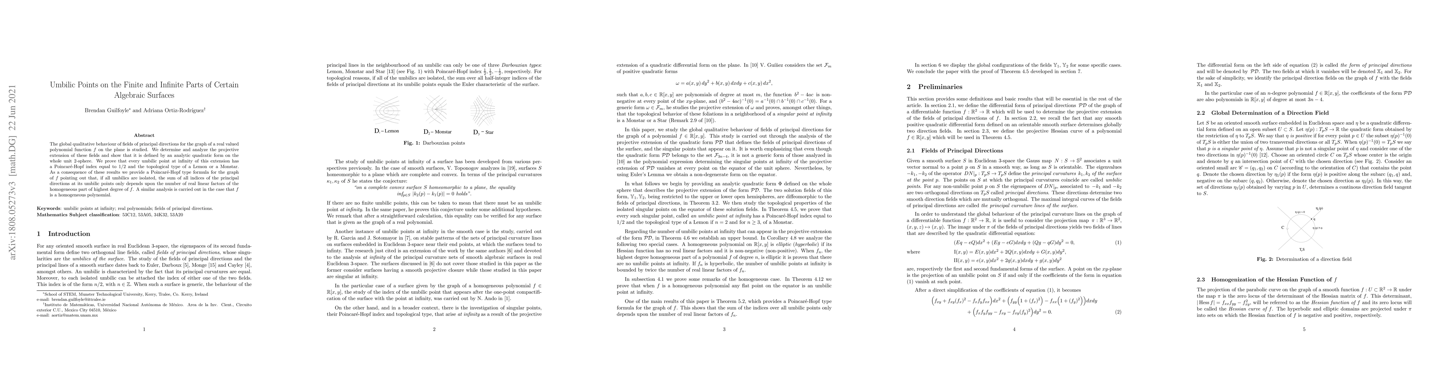 The global qualitative behaviour of fields of principal directions for the graph of a real valued polynomial function $f$ on the plane are studied. We provide a Poincar\'e-Hopf type formula where the sum over all indices of the principal directions at its umbilic points only depends upon the number of real linear factors of the homogeneous part of highest degree of $f$. Moreover, we study the projective extension of these fields and prove, under generic conditions, that every umbilic point at infinity of these extensions is isolated, has index equal to 1/2 and its topological type is a Lemon.