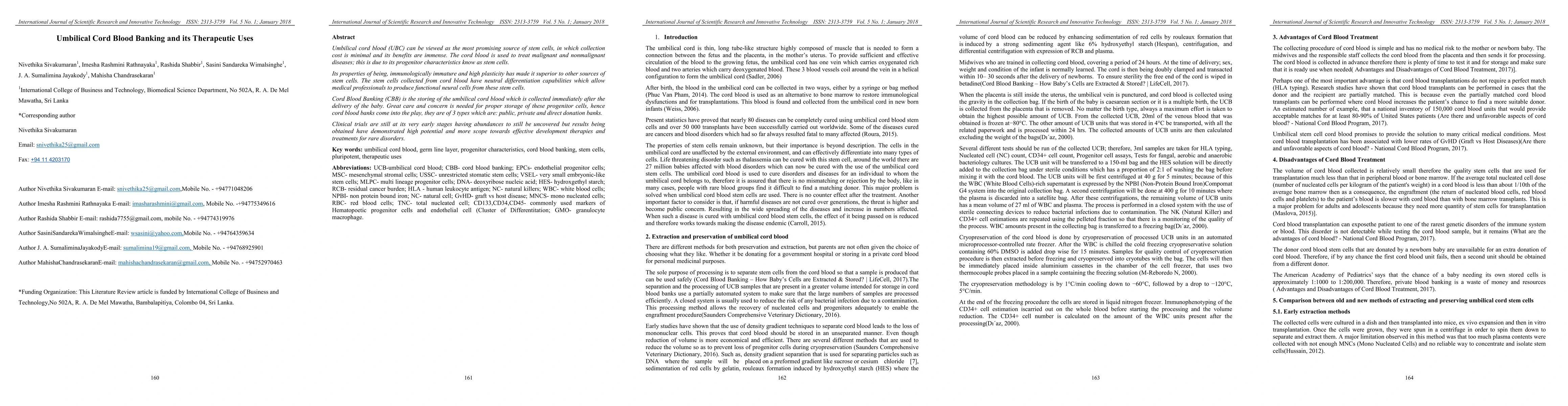 Umbilical cord blood (UBC) can be viewed as the most promising source of stem cells, in which collection cost is minimal and its benefits are immense. The cord blood is used to treat malignant and nonmalignant diseases; this is due to its progenitor characteristics know as stem cells.Its properties of being, immunologically immature and high plasticity has made it superior to other sources of stem cells. The stem cells collected from cord blood have neutral differentiation capabilities which allow medical professionals to produce functional neural cells from these stem cells.Cord Blood Banking (CBB) is the storing of the umbilical cord blood which is collected immediately after the delivery of the baby. Great care and concern are needed for proper storage of these progenitor cells, hence cord blood banks come into the play, they are of 3 types which are: public, private and direct donation banks.Clinical trials are still at its very early stages having abundances to still be uncovered but results were obtained have demonstrated high potential and more scope towards effective development therapies and treatments for rare disorders.