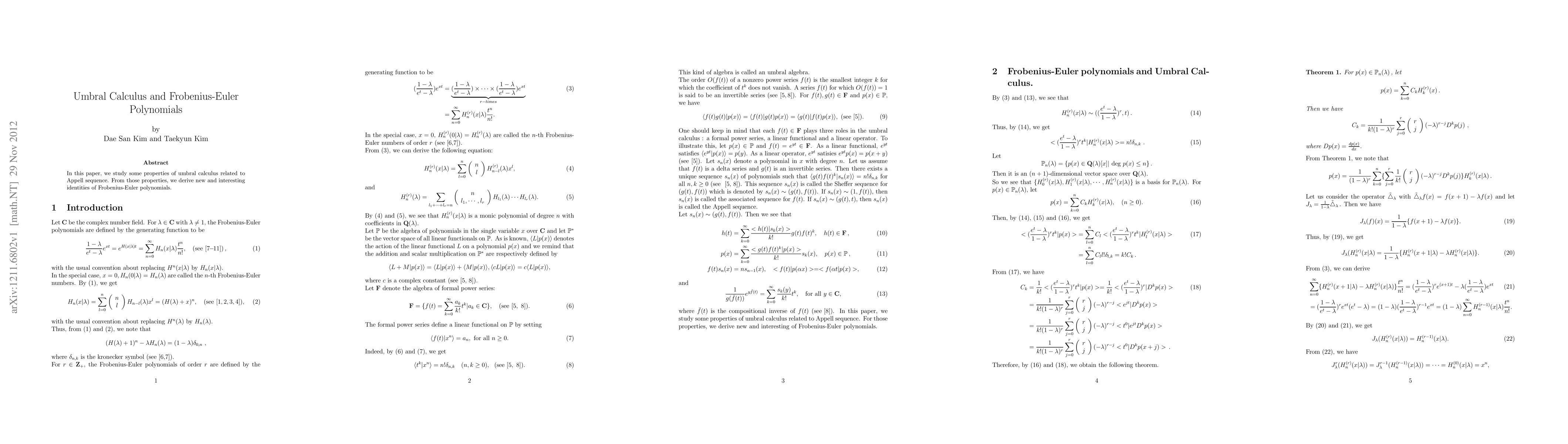 This paper explores the properties of umbral calculus connected to the Appell sequence and uses these properties to derive novel identities for Frobenius-Euler polynomials. The findings provide new insights into the relationships between umbral calculus and polynomial sequences.