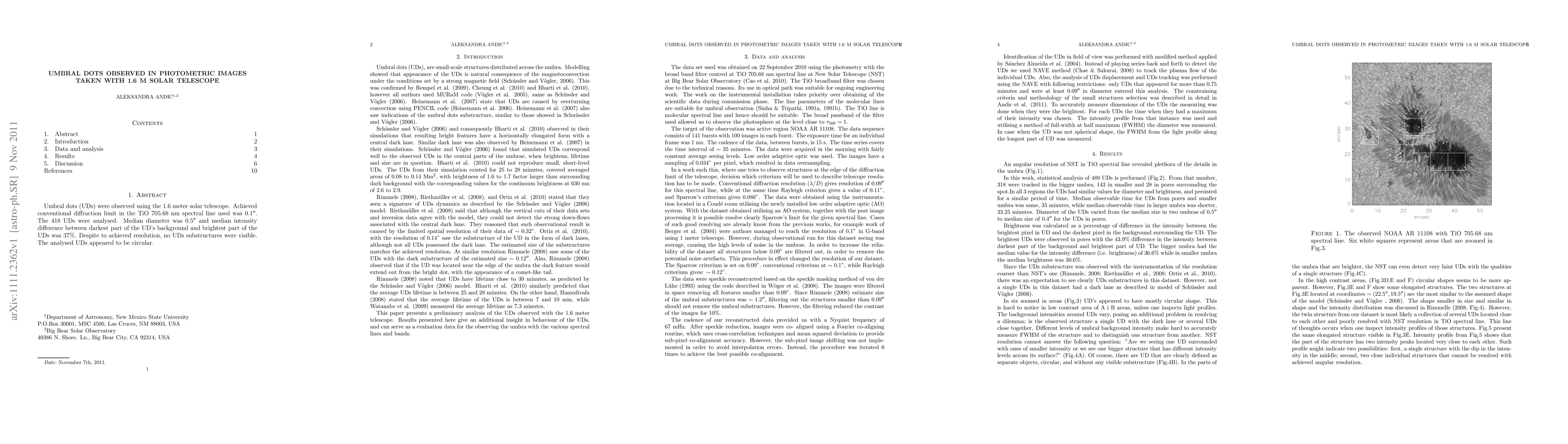 The research utilized the 1.6 m Solar Telescope to observe Umbral Dots (UDs) in sunspots, reaching a resolution of 0.1" in the TiO 705.68 nm spectral line. A total of 418 UDs were analyzed, found to be circular with a median diameter of 0.5" and a median intensity variation of 37%. Despite the high resolution, no substructures within the UDs were discernible.