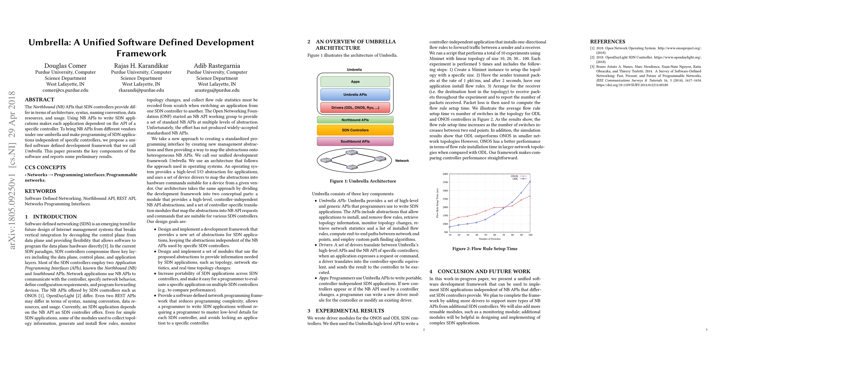 The paper proposes Umbrella, a unified software defined development framework to standardize Northbound APIs from different SDN controllers, thereby enabling controller-independent SDN application development. Preliminary results indicate the framework's potential to unify diverse NB APIs.