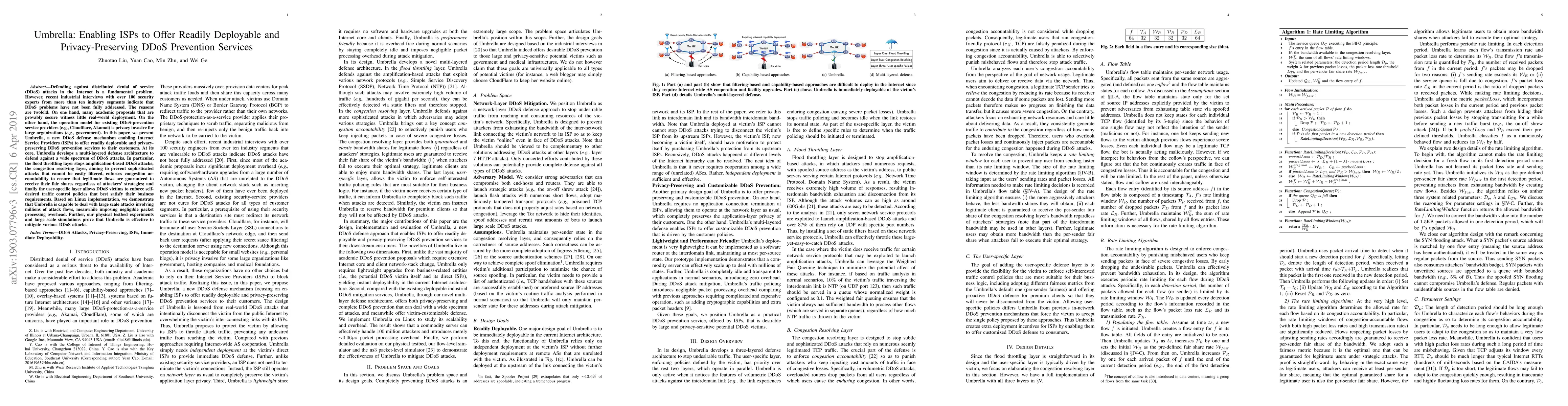 Umbrella presents a novel DDoS defense mechanism for ISPs, enabling them to deploy privacy-preserving services against a wide spectrum of attacks. The multi-layered architecture includes flood throttling, congestion resolving, and user-specific traffic control, demonstrating effectiveness and negligible overhead in large-scale attacks.