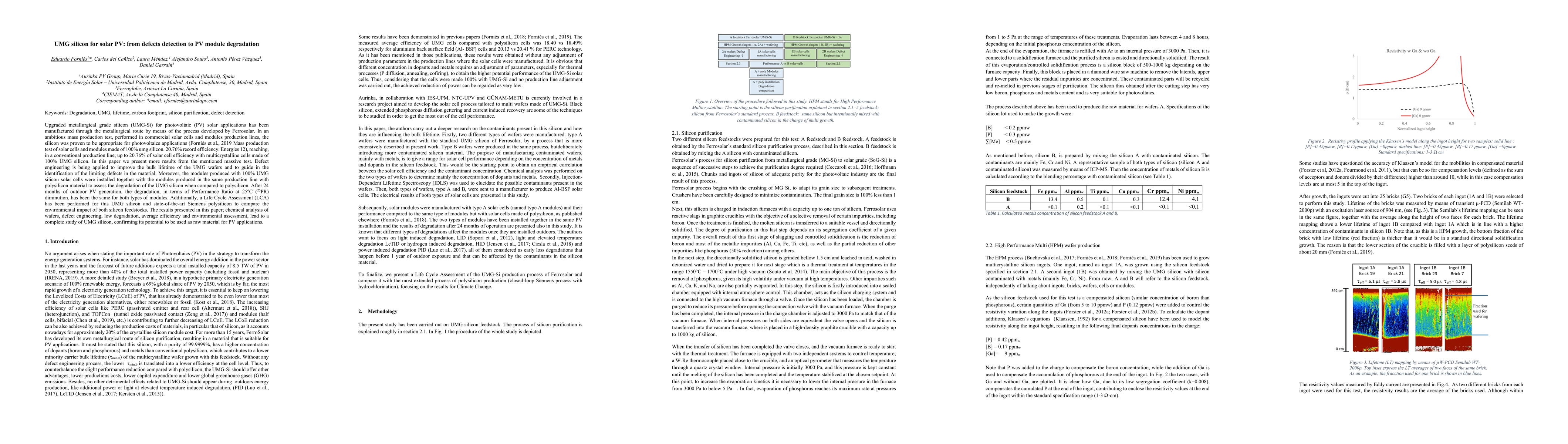 This paper investigates Upgraded Metallurgical Grade Silicon (UMG-Si) for solar PV applications, demonstrating its efficiency and degradation compared to polysilicon. After a 24-month outdoor test, UMG-Si modules showed equal degradation to polysilicon modules, and a Life Cycle Assessment confirmed its environmental benefits.