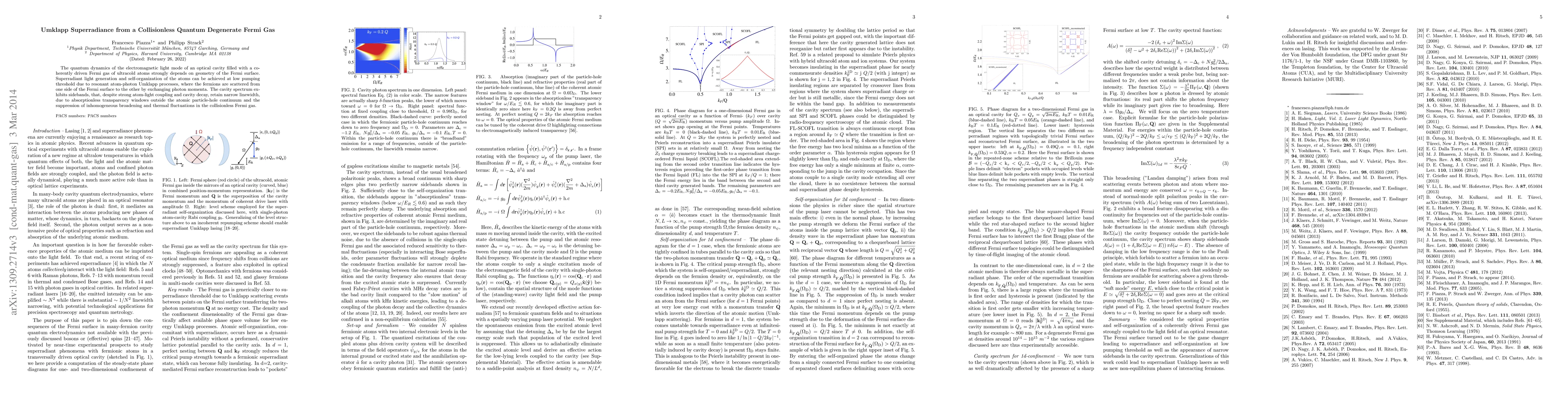 This paper explores superradiance in a collisionless quantum degenerate Fermi gas, demonstrating that low-threshold light generation and atomic self-organization occur via resonant Umklapp processes. The cavity spectrum shows narrow linewidth sidebands due to transparency windows and reduced broadening effects in the gas.