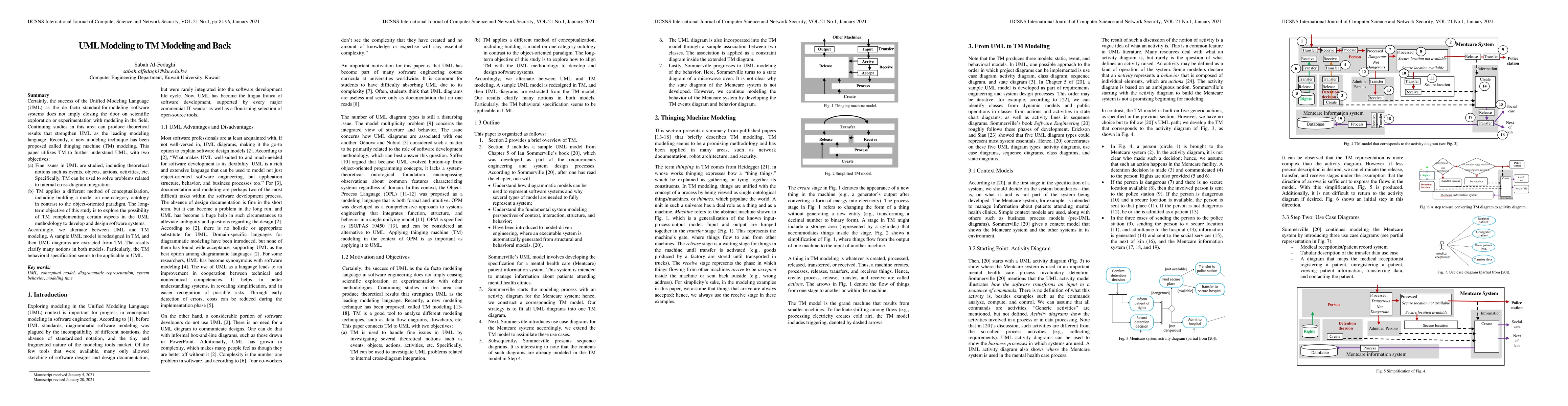 This paper explores the relationship between UML and the new TM modeling technique, aiming to understand UML through TM and vice versa. It investigates fine issues in UML using TM, finding potential for TM to complement UML in aspects like internal cross-diagram integration and behavioral specification.