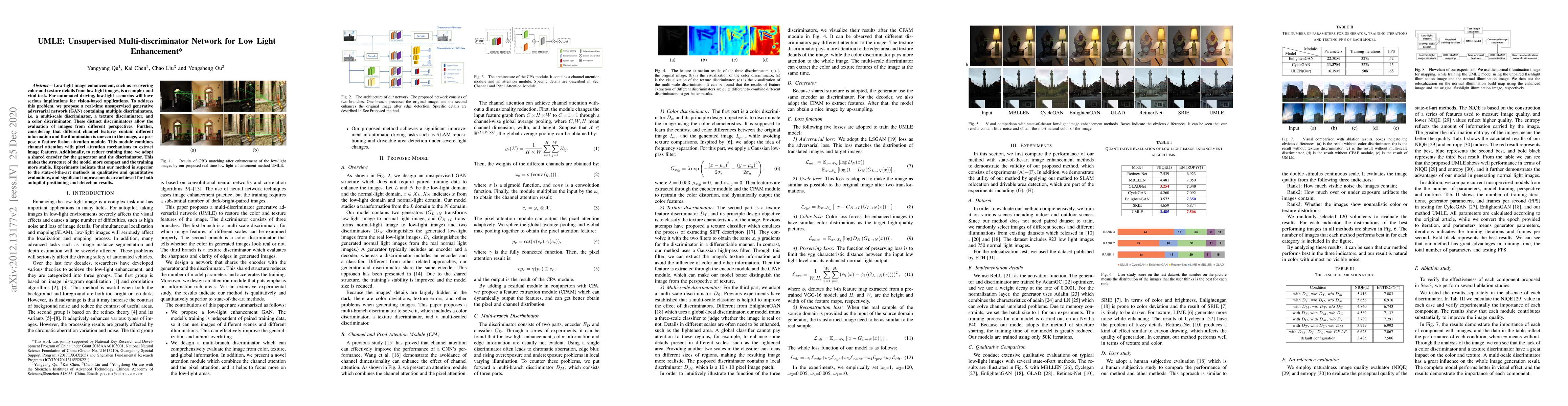 The paper proposes an unsupervised multi-discriminator GAN for low-light image enhancement, featuring a feature fusion attention module and a shared encoder to improve efficiency and performance. The method outperforms existing techniques in both qualitative and quantitative assessments, enhancing vision-based applications like automated driving.
