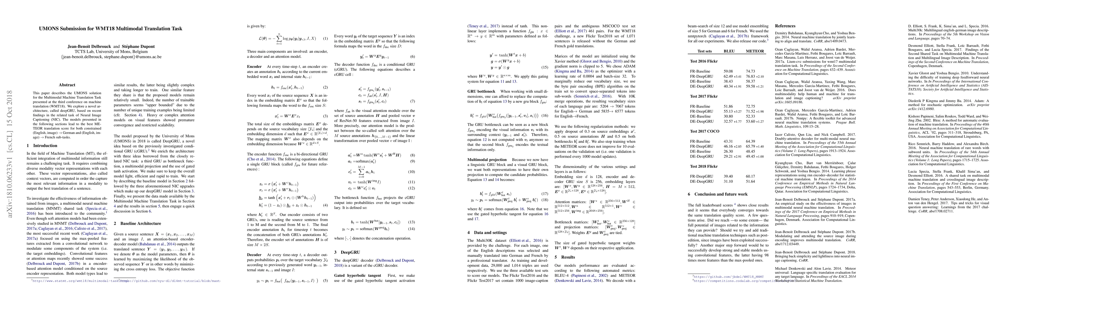 UMONS proposes a deepGRU architecture for the WMT18 Multimodal Translation Task, achieving the highest METEOR score for both English-German and English-French translations, leveraging insights from Neural Image Captioning.