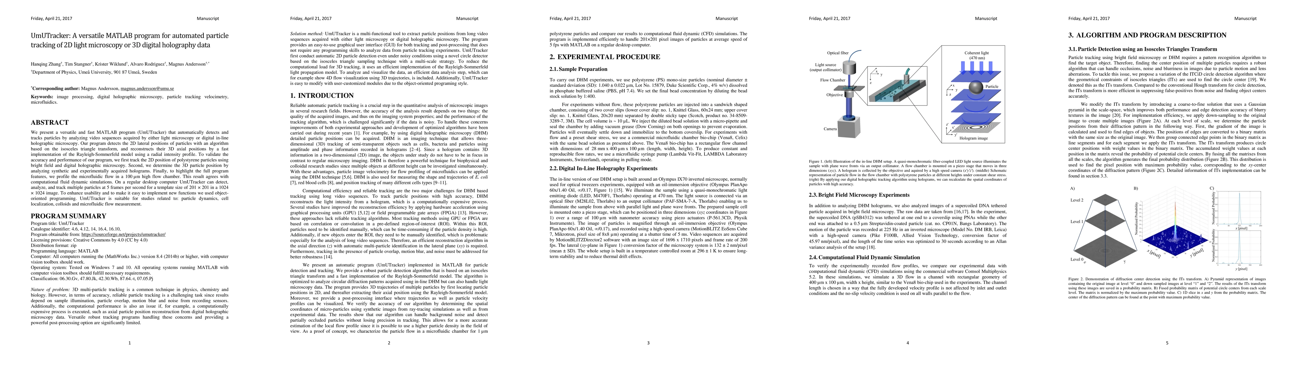 UmUTracker is a versatile MATLAB program for automated particle tracking in 2D light microscopy and 3D digital holography data. It accurately detects and tracks particles using an isosceles triangle transform for 2D positions and the Rayleigh-Sommerfeld model for 3D reconstruction, validated through experiments and microfluidic flow profiling.