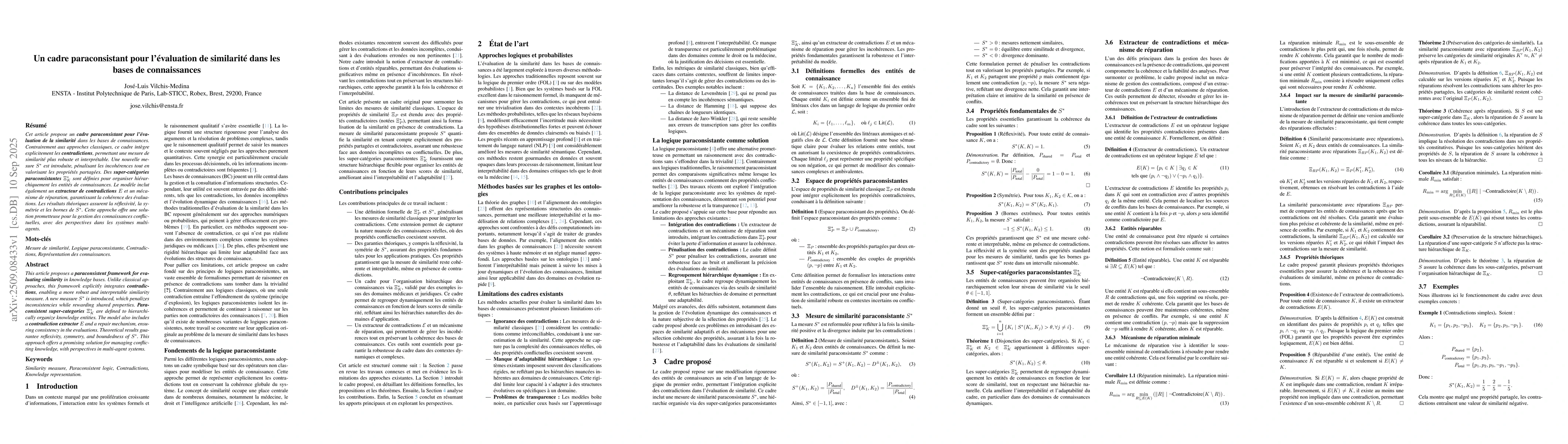 This article proposes a paraconsistent framework for evaluating similarity in knowledge bases. Unlike classical approaches, this framework explicitly integrates contradictions, enabling a more robust and interpretable similarity measure. A new measure $ S^* $ is introduced, which penalizes inconsistencies while rewarding shared properties. Paraconsistent super-categories $ \Xi_K^* $ are defined to hierarchically organize knowledge entities. The model also includes a contradiction extractor $ E $ and a repair mechanism, ensuring consistency in the evaluations. Theoretical results guarantee reflexivity, symmetry, and boundedness of $ S^* $. This approach offers a promising solution for managing conflicting knowledge, with perspectives in multi-agent systems.