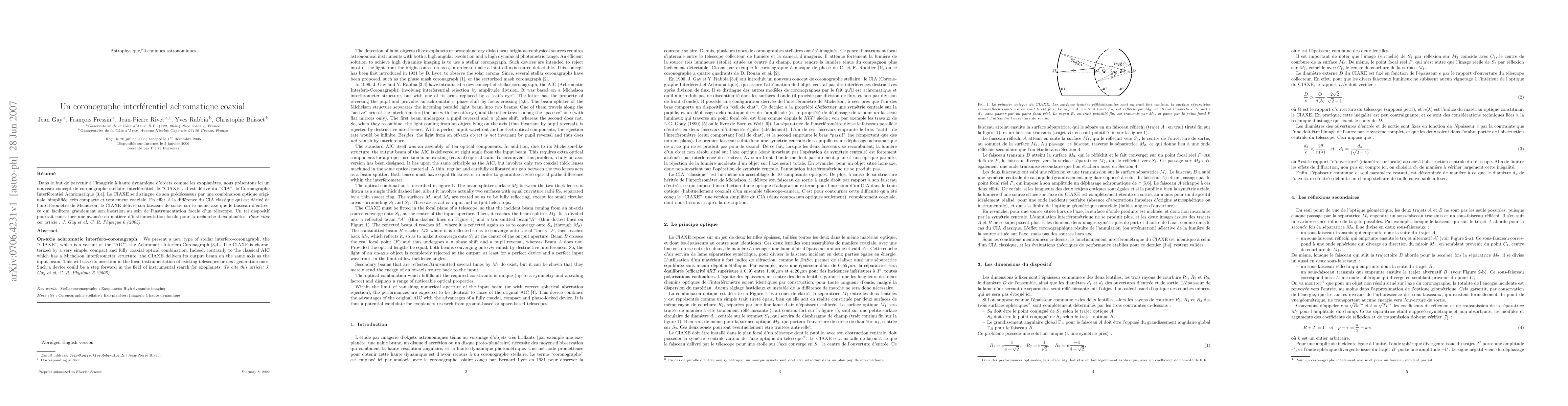 On-axis achromatic interfero-coronagraph. We present a new type of stellar interfero-coronagraph, the "CIAXE", which is a variant of the "AIC", the Achromatic Interfero-Coronagraph [3,4]. The CIAXE is characterized by a very simple, compact and fully coaxial optical combination. Indeed, contrarily to the classical AIC which has a Michelson interferometer structure, the CIAXE delivers its output beam on the same axis as the input beam. This will ease its insertion in the focal instrumentation of existing telescopes or next generation ones. Such a device could be a step forward in the field of instrumental search for exoplanets. ----- Dans le but deparvenir \`a l'imagerie \`a haute dynamique d'objets comme les exoplan\`etes, nous pr\'esentons ici un nouveau concept de coronographe stellaire interf\'erentiel, le "CIAXE". Il est d\'eriv\'e du "CIA", le Coronographe Interf\'erentiel Achromatique. Le CIAXE se distingue de son pr\'ed\'ecesseur par une combinaison optique originale, simplifi\'ee, tr\`es compacte et totalement coaxiale. En effet, \`a la diff\'erence du CIA classique qui est d\'eriv\'e de l'interf\'erom\`etre de Michelson, le CIAXE d\'elivre son faisceau de sortie sur le m\^eme axe que le faisceau d'entr\'ee, ce qui facilitera grandement son insertion au sein de l'instrumentation focale d'un t\'elescope. Un tel dispositif pourrait constituer une avanc\'ee en mati\`ere d'instrumentation focale pour la recherche d'exoplan\`etes.