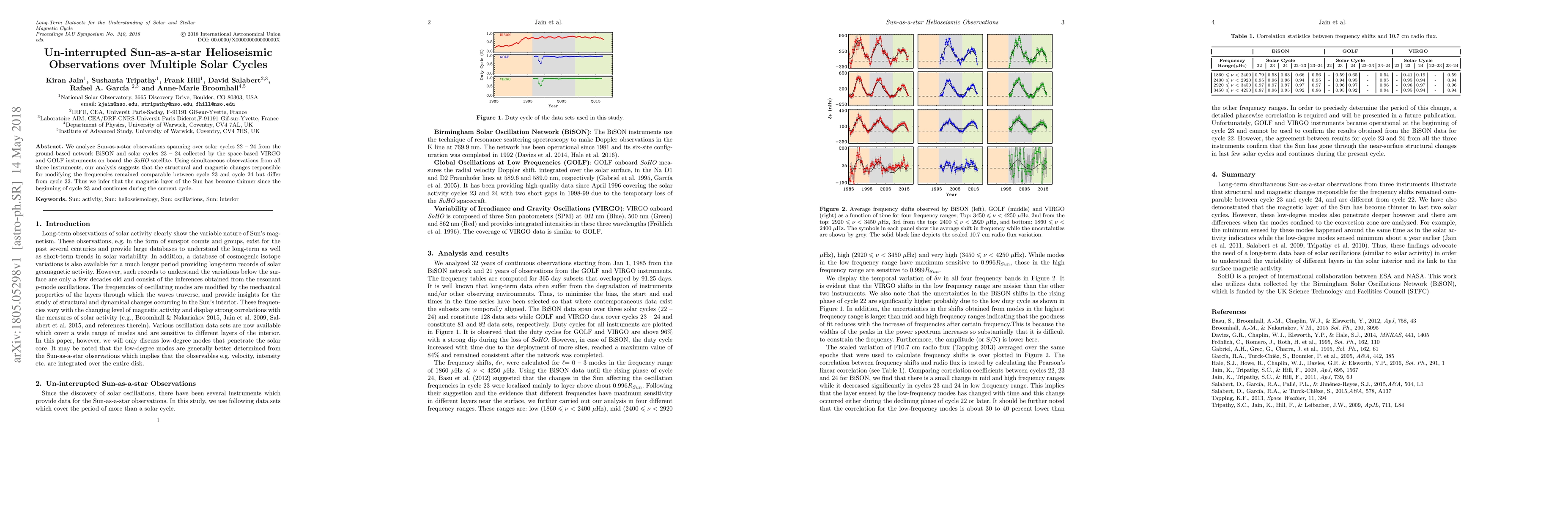We analyze Sun-as-a-star observations spanning over solar cycles 22 -- 24 from the ground-based network BiSON and solar cycles 23 -- 24 collected by the space-based VIRGO and GOLF instruments on board the {\it SoHO} satellite. Using simultaneous observations from all three instruments, our analysis suggests that the structural and magnetic changes responsible for modifying the frequencies remained comparable between cycle 23 and cycle 24 but differ from cycle 22. Thus we infer that the magnetic layer of the Sun has become thinner since the beginning of cycle 23 and continues during the current cycle.