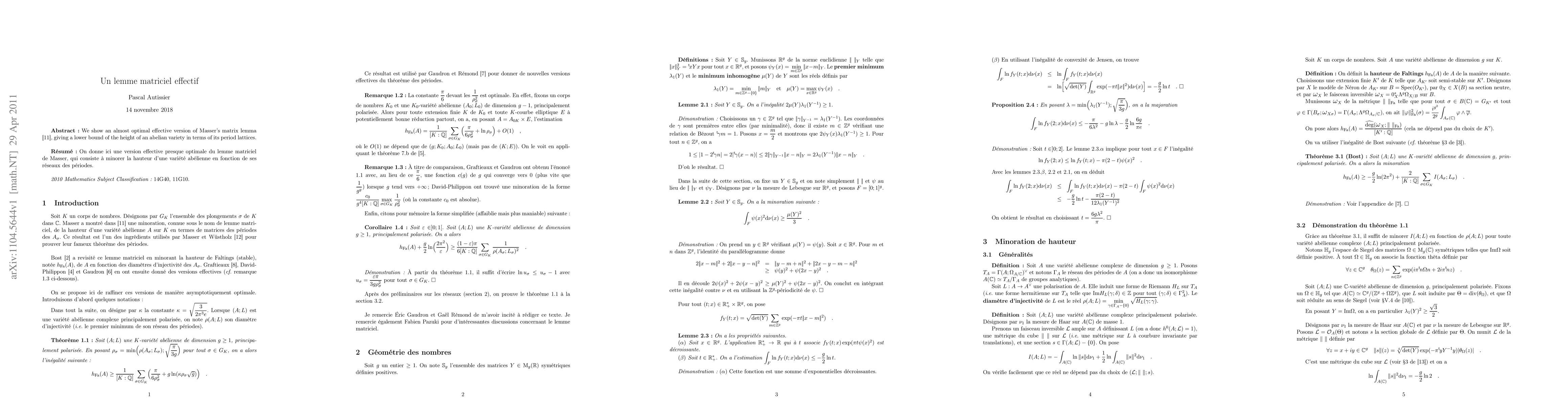 We show an almost optimal effective version of Masser's matrix lemma, giving a lower bound of the height of an abelian variety in terms of its period lattices.