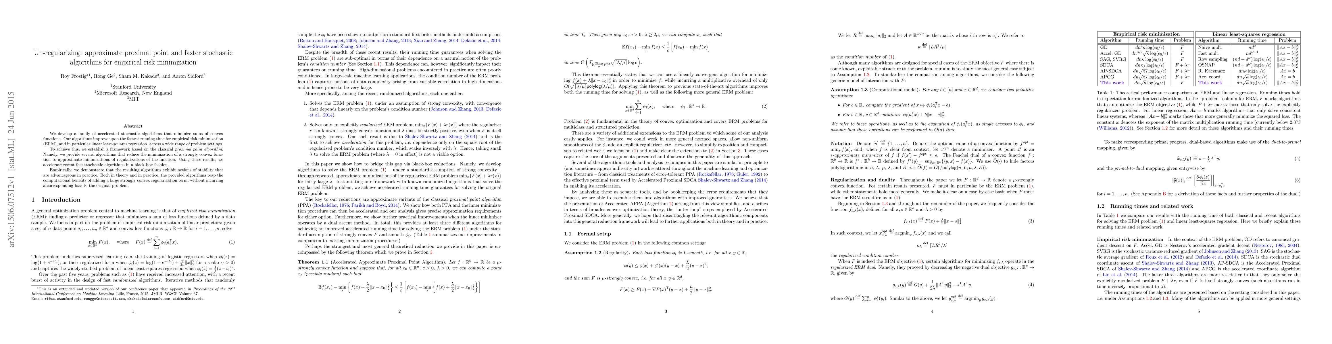 We develop a family of accelerated stochastic algorithms that minimize sums of convex functions. Our algorithms improve upon the fastest running time for empirical risk minimization (ERM), and in particular linear least-squares regression, across a wide range of problem settings. To achieve this, we establish a framework based on the classical proximal point algorithm. Namely, we provide several algorithms that reduce the minimization of a strongly convex function to approximate minimizations of regularizations of the function. Using these results, we accelerate recent fast stochastic algorithms in a black-box fashion. Empirically, we demonstrate that the resulting algorithms exhibit notions of stability that are advantageous in practice. Both in theory and in practice, the provided algorithms reap the computational benefits of adding a large strongly convex regularization term, without incurring a corresponding bias to the original problem.