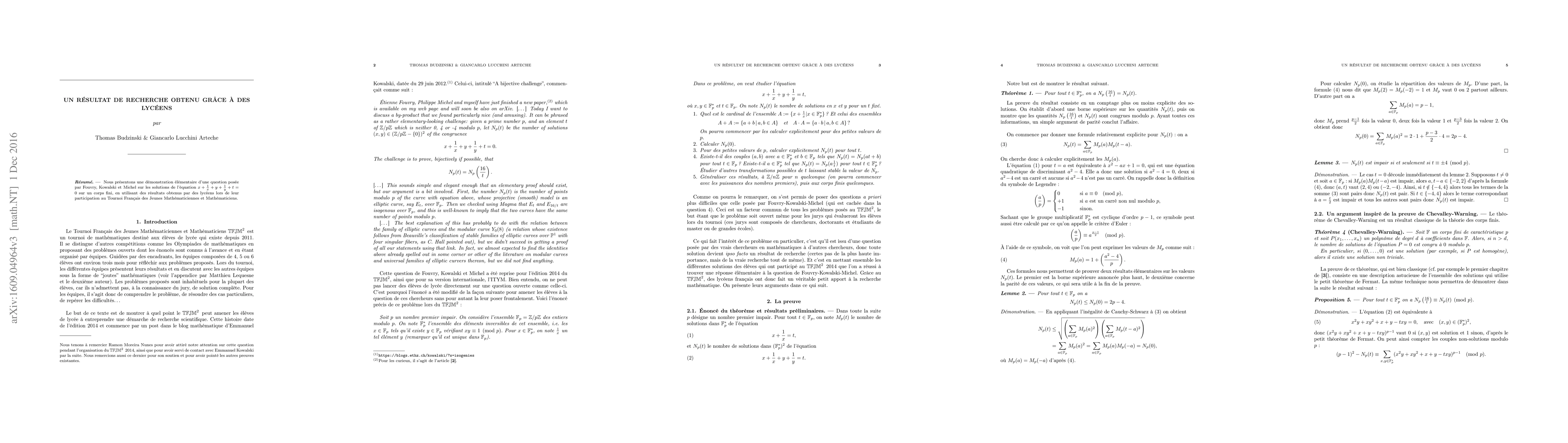 We give an elementary proof of a question asked by Fouvry, Kowalski and Michel on the solutions of the equation $x+\frac{1}{x}+y+\frac{1}{y}+t=0$ over a finite field, using the results obtained by highschool students during their participation at the maths tournament "Tournoi Fran\c{c}ais des Jeunes Math\'ematiciennes et Math\'ematiciens". Nous pr\'esentons une d\'emonstration \'el\'ementaire d'une question pos\'ee par Fouvry, Kowalski et Michel sur les solutions de l'\'equation $x+\frac{1}{x}+y+\frac{1}{y}+t=0$ sur un corps fini, en utilisant des r\'esultats obtenus par des lyc\'eens lors de leur participation au Tournoi Fran\c{c}ais des Jeunes Math\'ematiciennes et Math\'ematiciens.