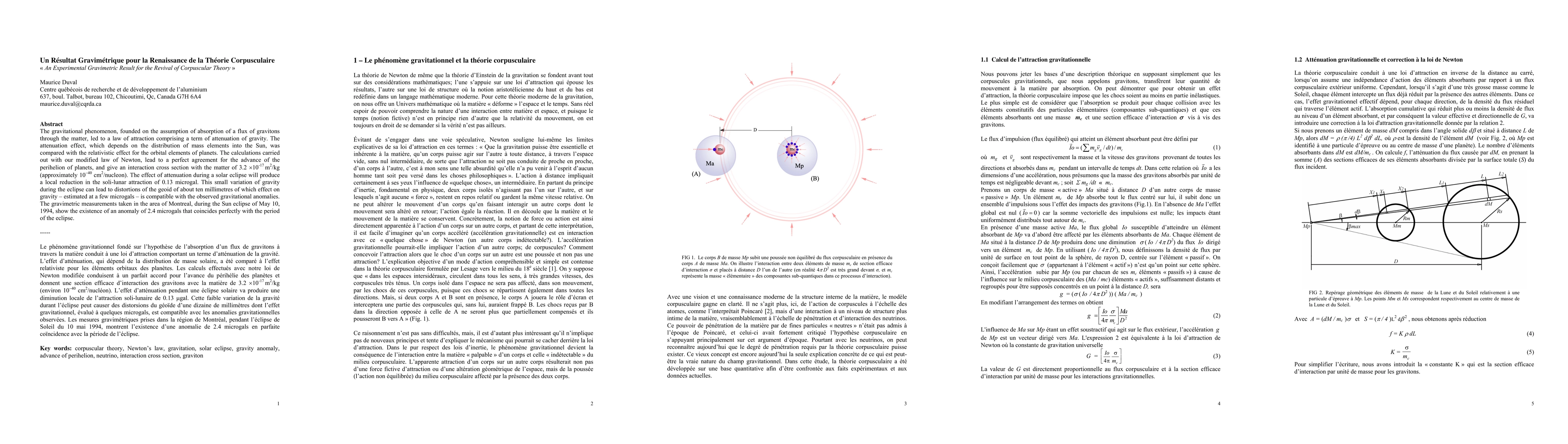 The gravitational phenomenon, founded on the assumption of absorption of a flux of gravitons through the matter, led to a law of attraction comprising a term of attenuation of gravity. The attenuation effect, which depends on the distribution of mass elements into the Sun, was compared with the relativistic effect for the orbital elements of planets. The calculations carried out with our modified law of Newton, lead to a perfect agreement for the advance of the perihelion of planets, and give an interaction cross section with the matter of 3.2x10^-17 m2/kg (approximately 10^-40 cm2/nucleon). The effect of attenuation during a solar eclipse will produce a local reduction in the soli-lunar attraction of 0.13 microgal. This small variation of gravity during the eclipse can lead to distortions of the geoid of about ten millimetres of which effect on gravity, estimated at a few microgals, is compatible with the observed gravitational anomalies. The gravimetric measurements taken in the area of Montreal during the Sun eclipse of May 10, 1994, show the existence of an anomaly of 2.4 microgals that coincides perfectly with the period of the eclipse.