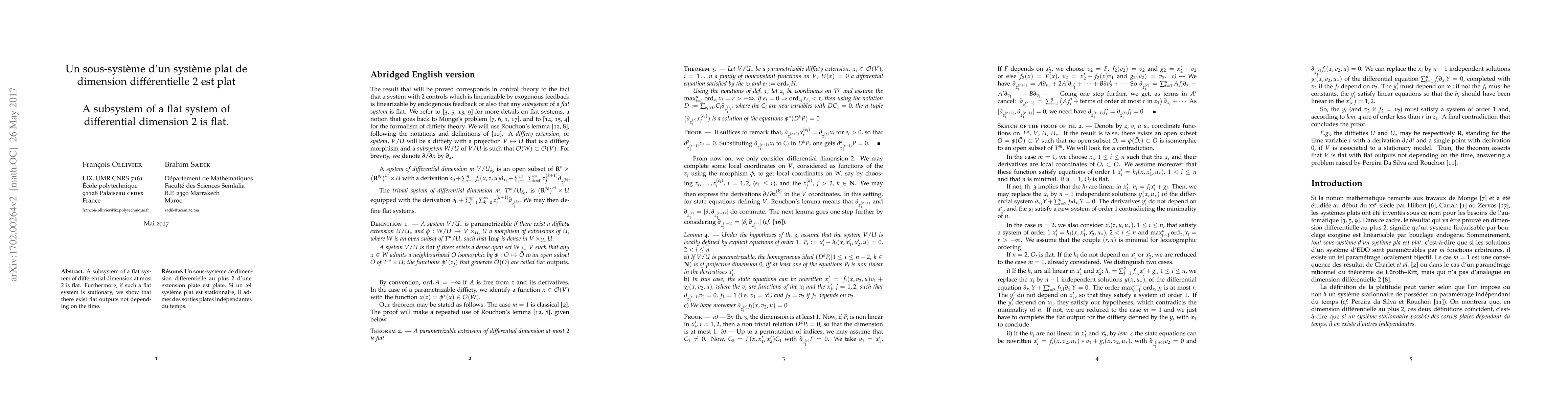Un sous-syst\`eme de dimension diff\'erentielle au plus 2 d'une extension plate est plate. Si un tel syst\`eme plat est stationnaire, il admet des sorties plates ind\'ependantes du temps. A subsystem of a flat system of differential dimension at most 2 is flat. Furthermore, if such a flat system is stationary, we show that there exist flat utputs not depending on the time.