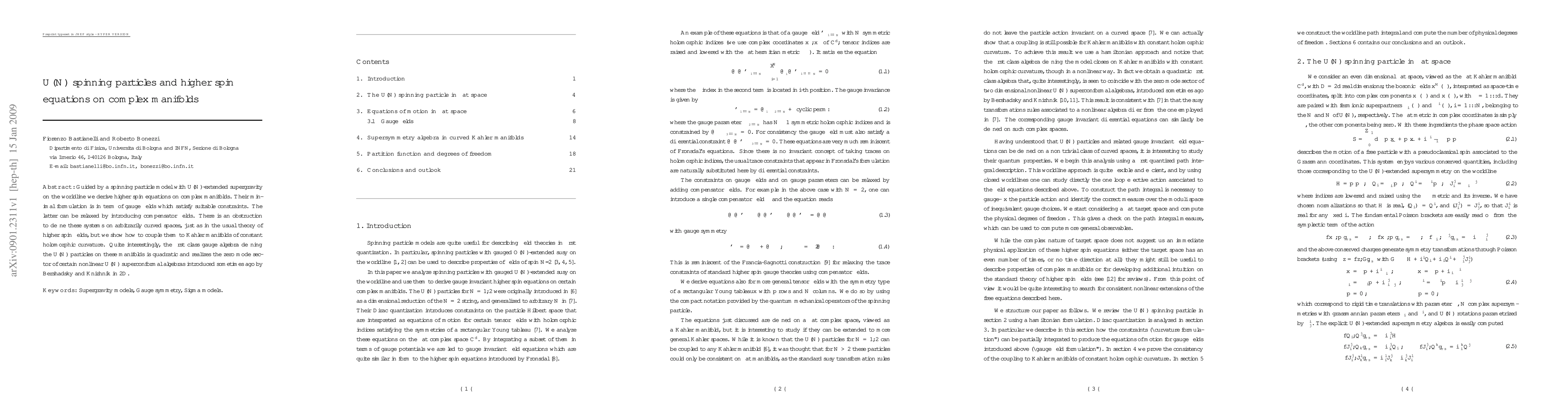This paper derives higher spin equations for U(N) spinning particles on complex manifolds, showing their minimal formulation in terms of constrained gauge fields. It addresses the coupling of these systems to Kähler manifolds with constant holomorphic curvature and reveals a quadratic first-class gauge algebra realizing the zero mode sector of certain nonlinear U(N) superconformal algebras.