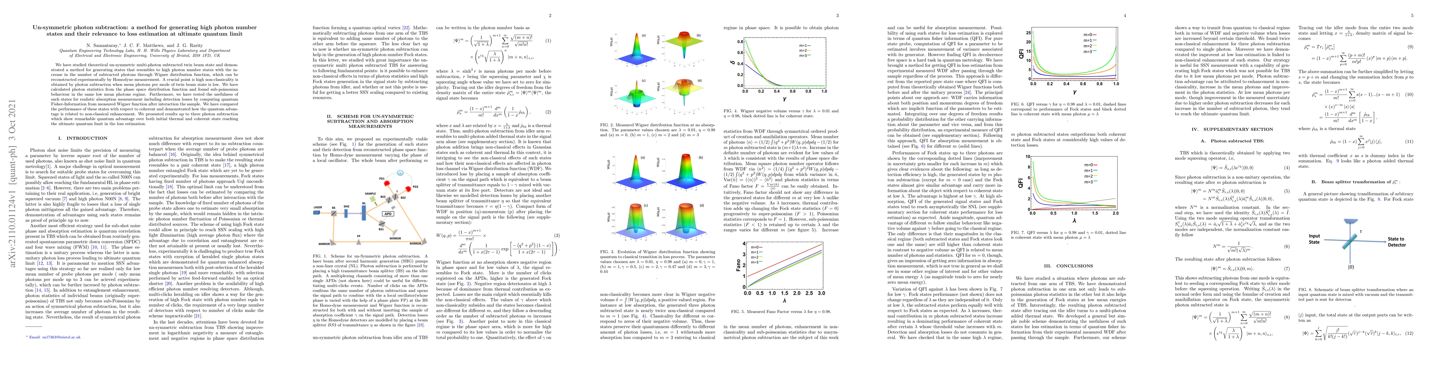 We have studied theoretical un-symmetric multi-photon subtracted twin beam state and demonstrated a method for generating states that resembles to high photon number states with the increase in the number of subtracted photons through Wigner distribution function, which can be reconstructed experimentally by Homodyne measurement. A crucial point is high non-classicality is obtained by photon subtraction when mean photons per mode of twin beam state is low. We have calculated photon statistics from the phase space distribution function and found sub-poissonian behaviour in the same low mean photons regime. Furthermore, we have tested the usefulness of such states for realistic absorption measurement including detection losses by computing quantum Fisher-Information from measured Wigner function after interaction the sample. We have compared the performance of these states with respect to coherent and demonstrated how the quantum advantage is related to non-classical enhancement. We presented results up to three photon subtraction which show remarkable quantum advantage over both initial thermal and coherent state reaching the ultimate quantum limit in the loss estimation.