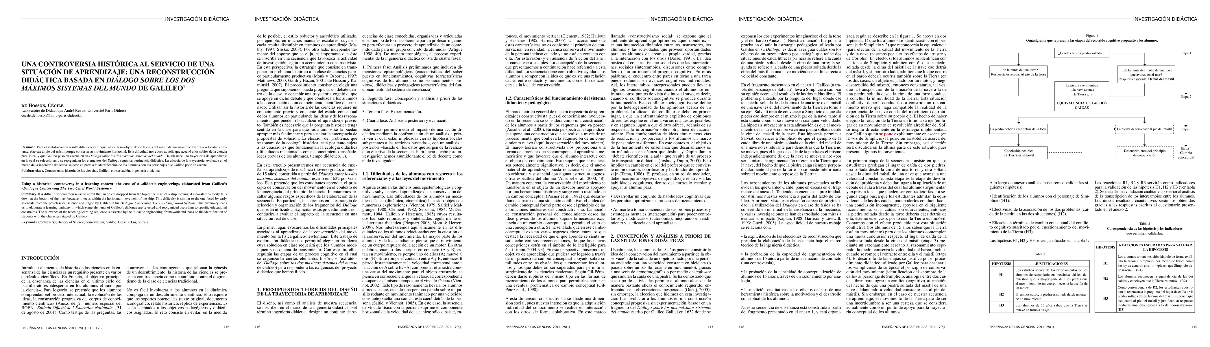 It is difficult for the common sense to admit that an object dropped from the top of the mast of a ship moving at a constant velocity falls down at the bottom of the mast because it keeps inside the horizontal movement of the ship. This difficulty is similar to the one faced by early scientists from the pre-classical science and staged by Galileo in his Dialogue concerning the two chief world systems. This proximity leads us to elaborate a learning pathway in which some elements of Galileo's dialogue are selected and reorganized according to specific educational constraints. The relevance of the teaching-learning sequence is asserted by the `didactical engineering' framework and leans on the identification of students with the characters staged by Galileo.