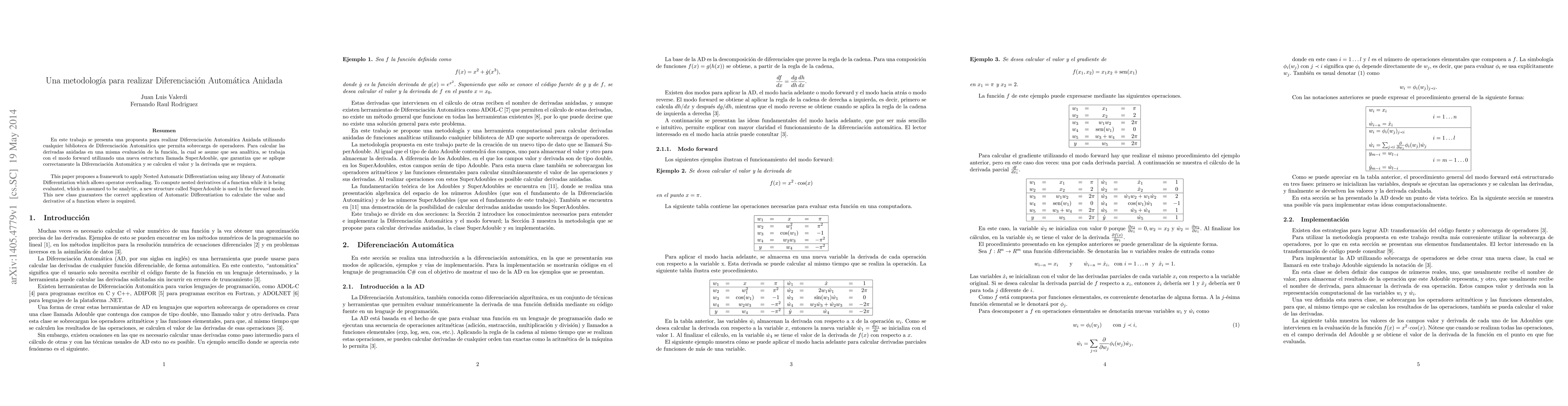En este trabajo se presenta una propuesta para realizar Diferenciaci\'on Autom\'atica Anidada utilizando cualquier biblioteca de Diferenciaci\'on Autom\'atica que permita sobrecarga de operadores. Para calcular las derivadas anidadas en una misma evaluaci\'on de la funci\'on, la cual se asume que sea anal\'itica, se trabaja con el modo forward utilizando una nueva estructura llamada SuperAdouble, que garantiza que se aplique correctamente la Diferenciaci\'on Autom\'atica y se calculen el valor y la derivada que se requiera. This paper proposes a framework to apply Nested Automatic Differentiation using any library of Automatic Differentiation which allows operator overloading. To compute nested derivatives of a function while it is being evaluated, which is assumed to be analytic, a new structure called SuperAdouble is used in the forward mode. This new class guarantees the correct application of Automatic Differentiation to calculate the value and derivative of a function where is required.