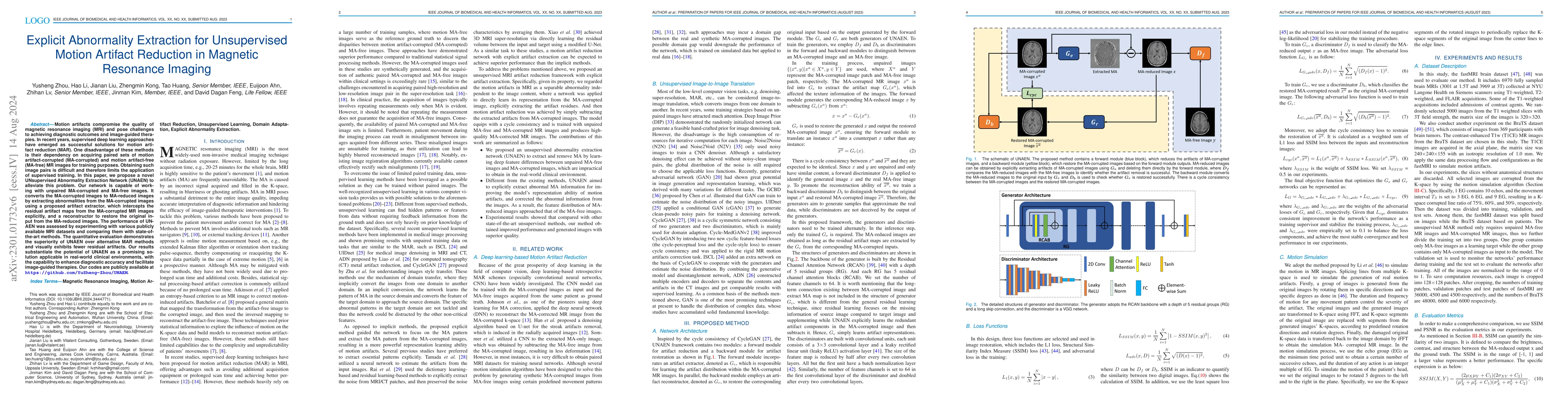 The UNAEN network proposes an unsupervised method for MRI motion artifact reduction using unpaired corrupted and artifact-free images, outperforming supervised methods by extracting and reducing artifacts without requiring paired training data. The method shows superior performance in quantitative and visual evaluations on various MRI datasets.