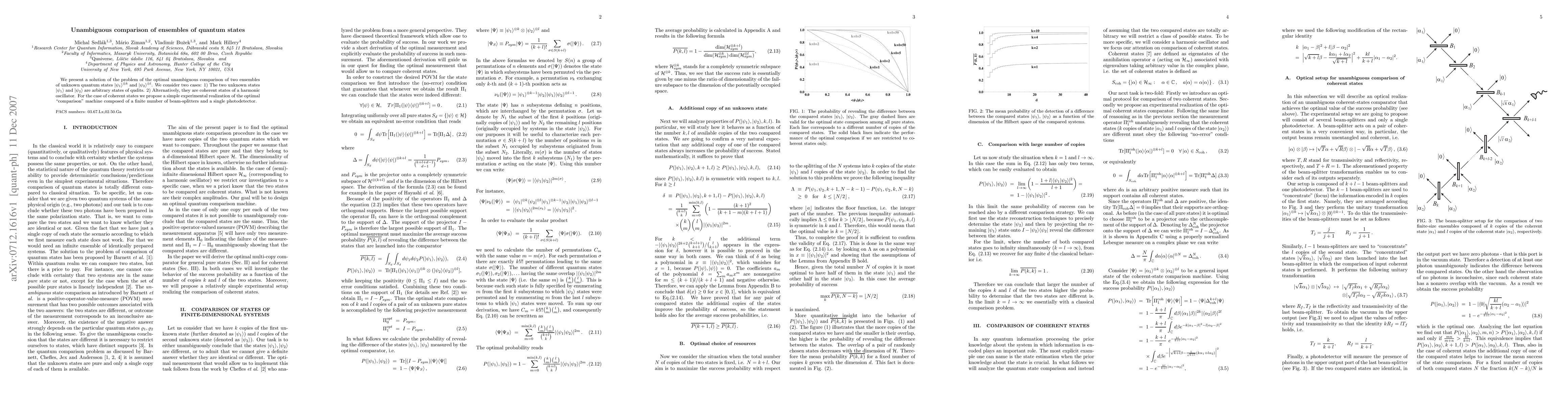 We present a solution of the problem of the optimal unambiguous comparison of two ensembles of unknown quantum states (psi_1)^k and (psi_2)^l. We consider two cases: 1) The two unknown states psi_1 and psi_2 are arbitrary states of qudits. 2) Alternatively, they are coherent states of a harmonic oscillator. For the case of coherent states we propose a simple experimental realization of the optimal "comparison" machine composed of a finite number of beam-splitters and a single photodetector.