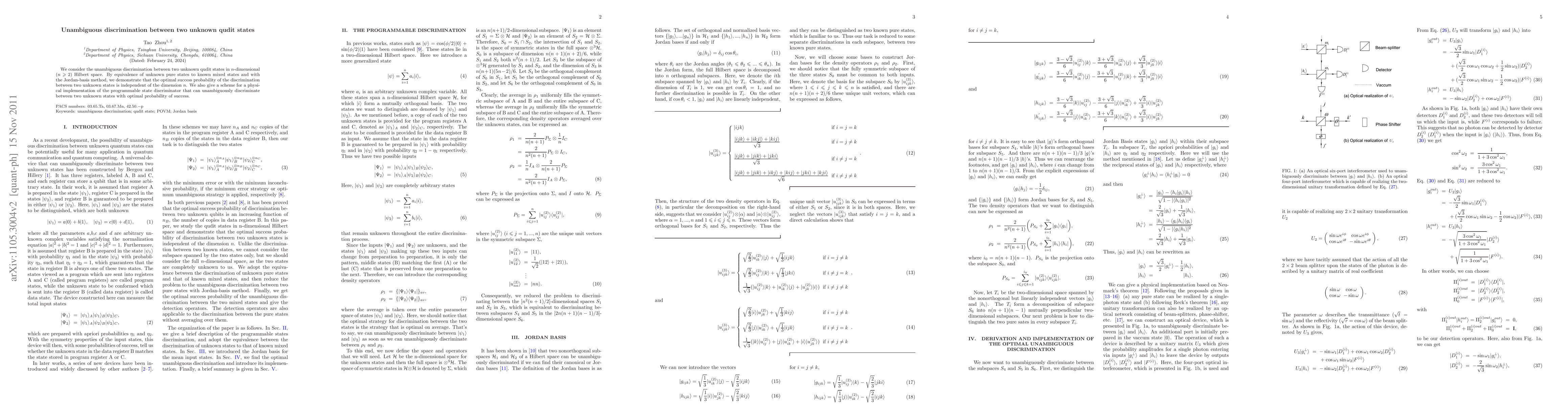 This paper demonstrates that the optimal success probability for unambiguously discriminating between two unknown qudit states in an $n$-dimensional Hilbert space is independent of $n$, using the equivalence of pure states to mixed states and the Jordan-basis method. It also presents a scheme for a physical implementation of a programmable state discriminator achieving this optimal success probability.
